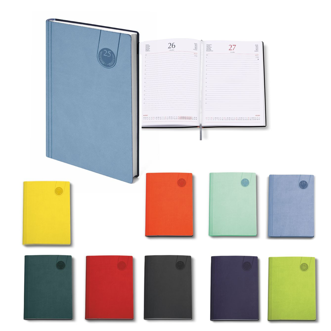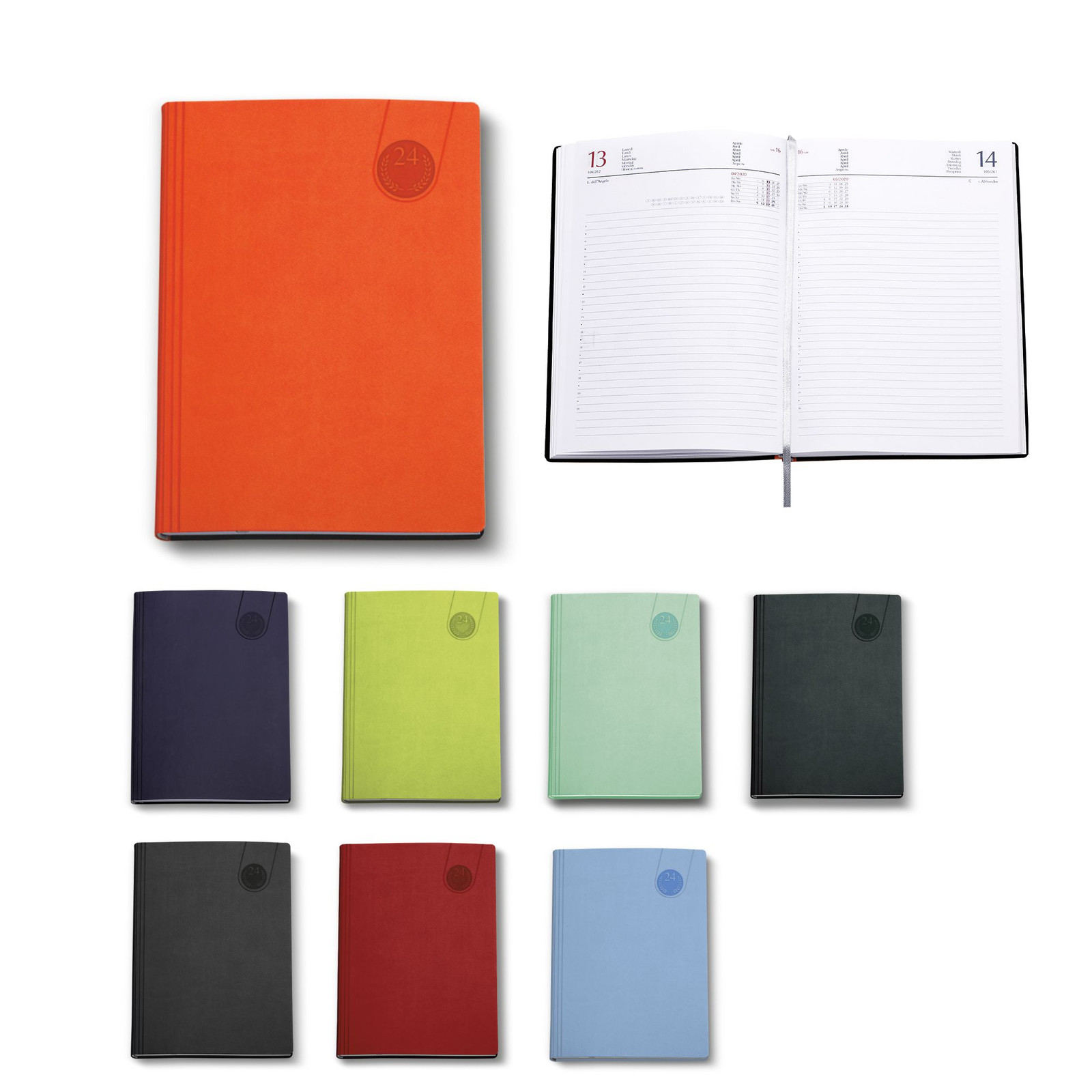Agenda giornalera”Tavecchi”. 396 pag. Materiale: printflex termovirante. Interno stampa 2 colori. Multi-lingue Carta bianca. Cartina geografica, rubrica telefonica. Sabato e domenica separati Colori: arancio, blu, rosso, nero verde, verde acido. Dimensioni cm.17x24
