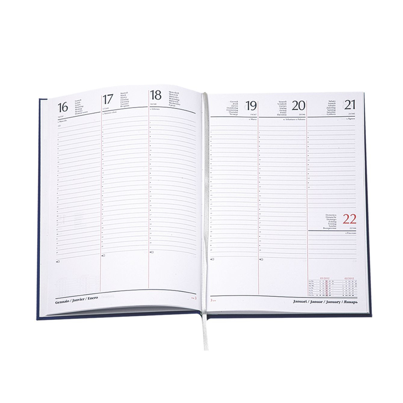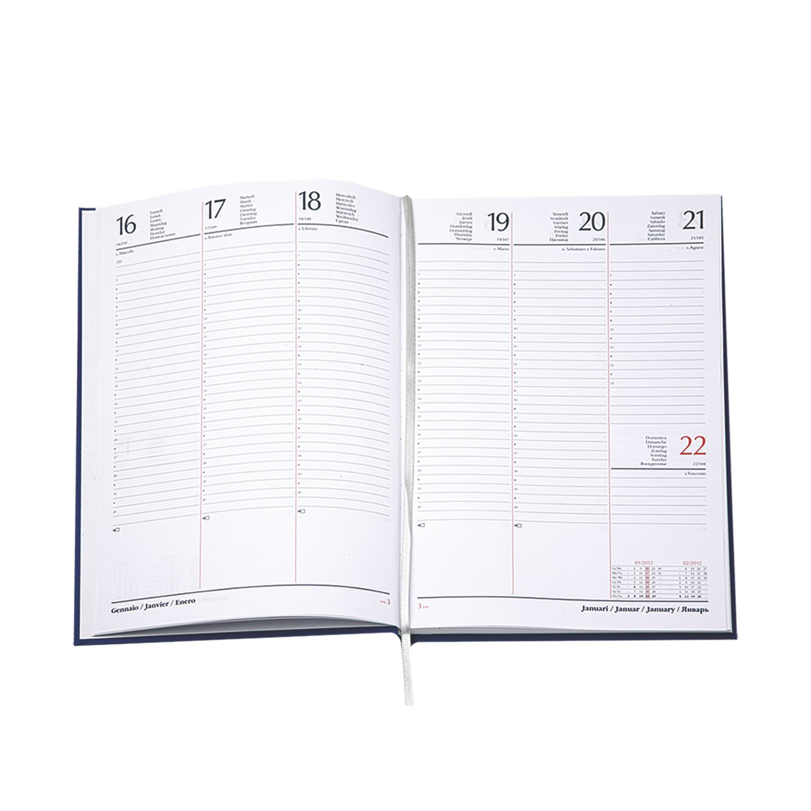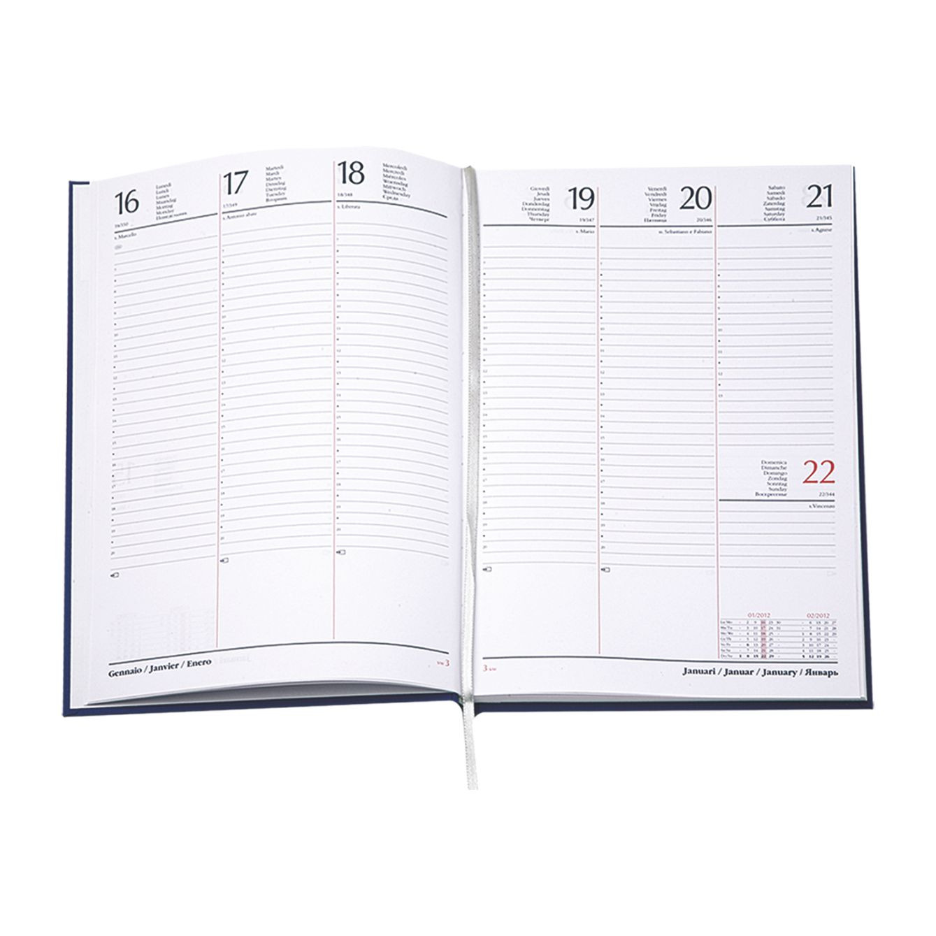 Agenda settimanale in matra. 128 pag. Interno stampa 2 colori. Multilingue. Rubrica telefonica, cartina geografica, piano ferie. Colore unico. Dimensioni cm 17x24 Imballo: 30