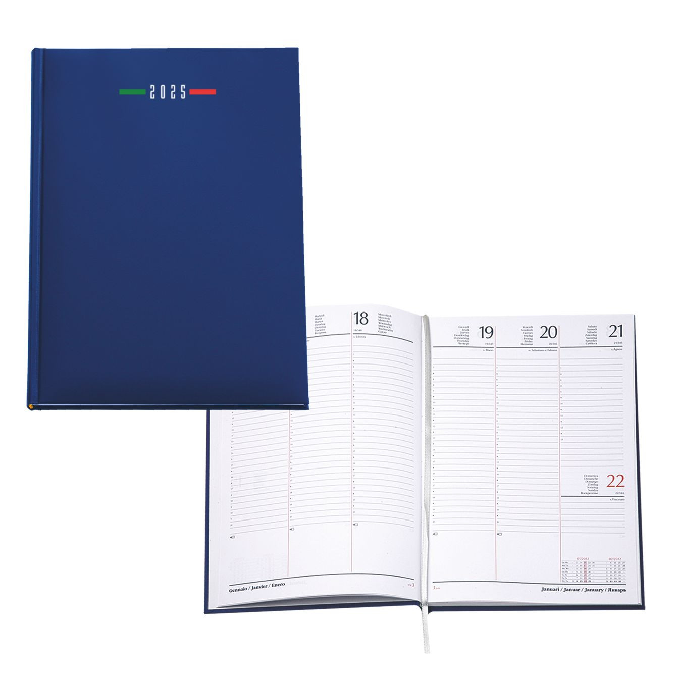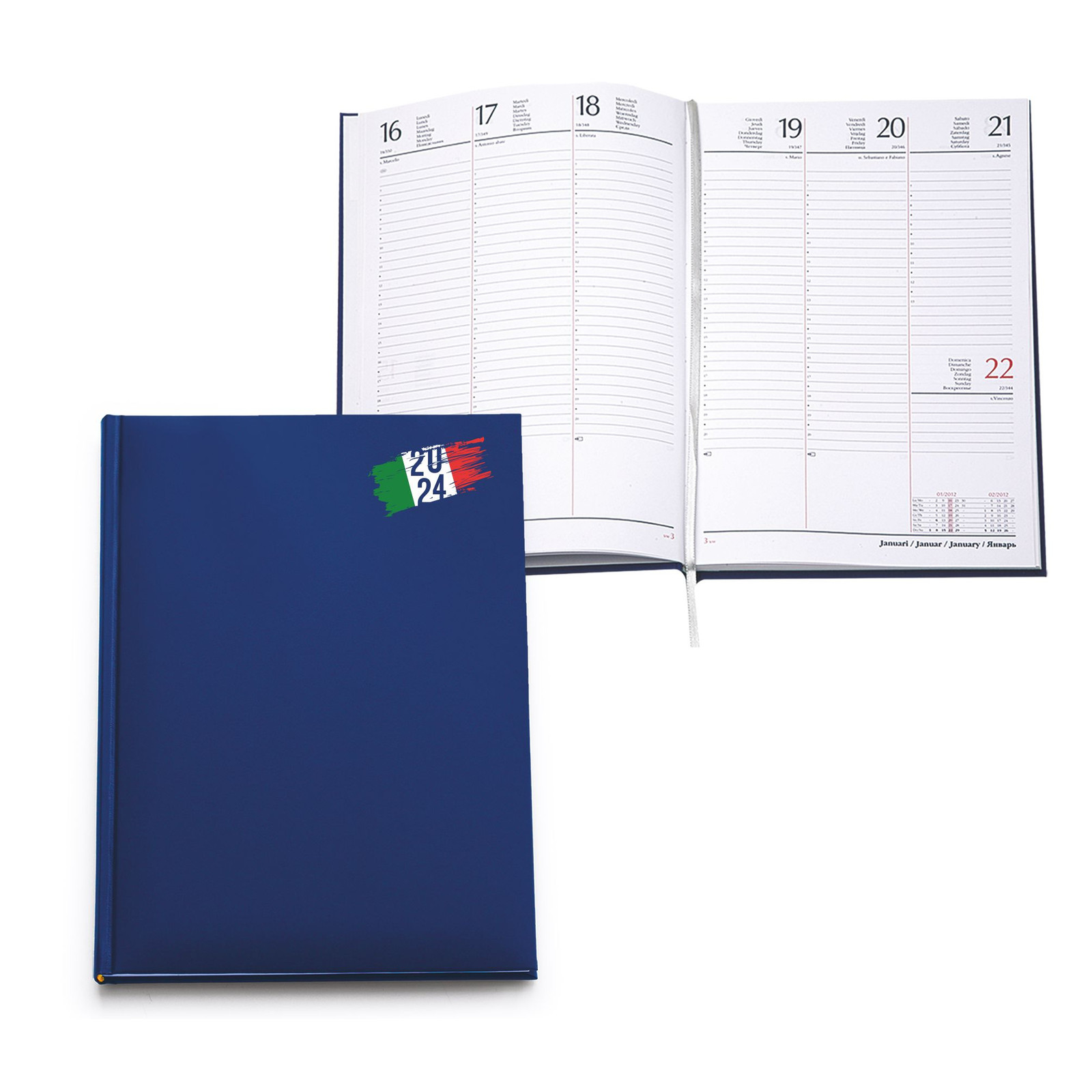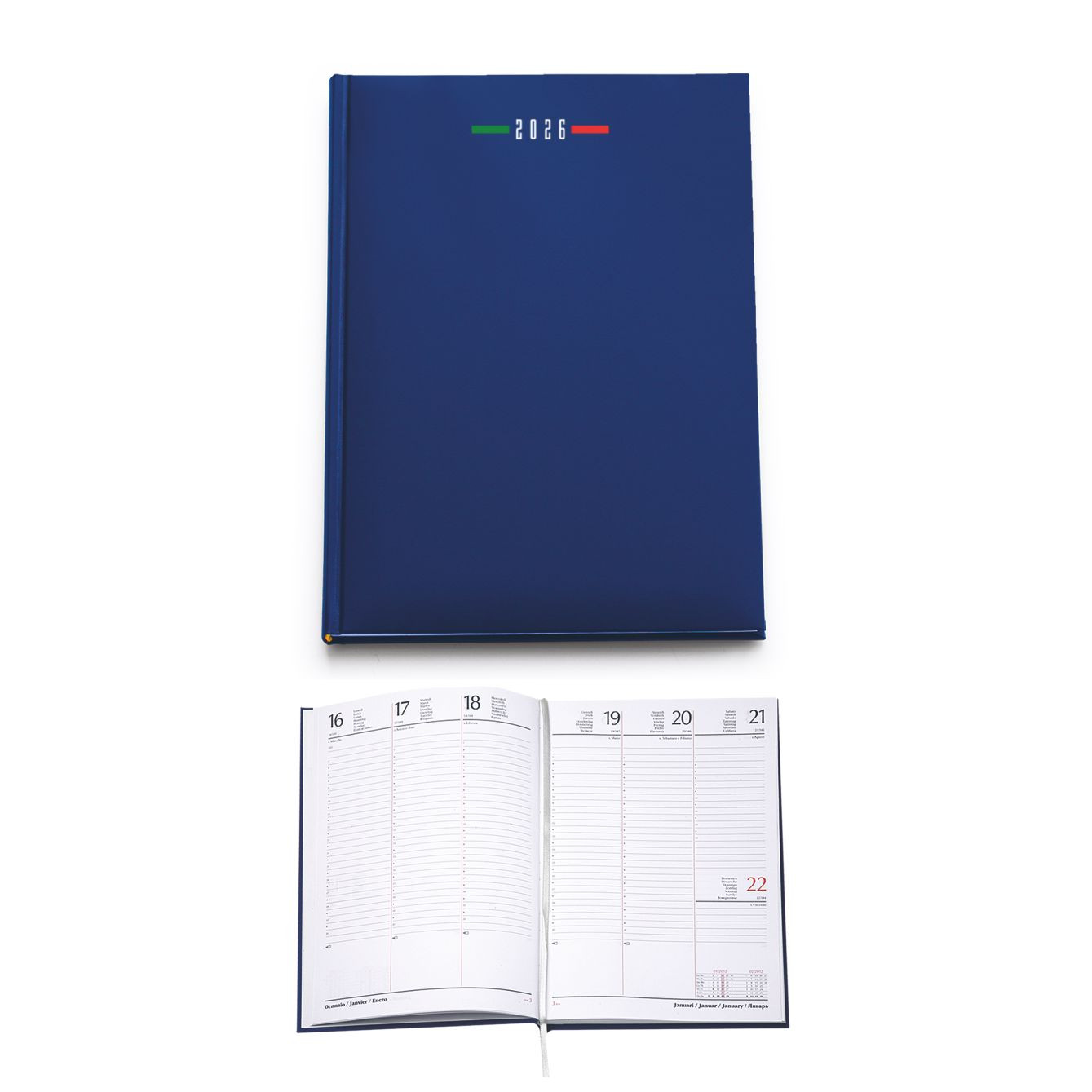 Agenda settimanale in matra. 128 pag. Interno stampa 2 colori. Multilingue. Rubrica telefonica, cartina geografica, piano ferie. Colore unico. Dimensioni cm 17x24 Imballo: 30