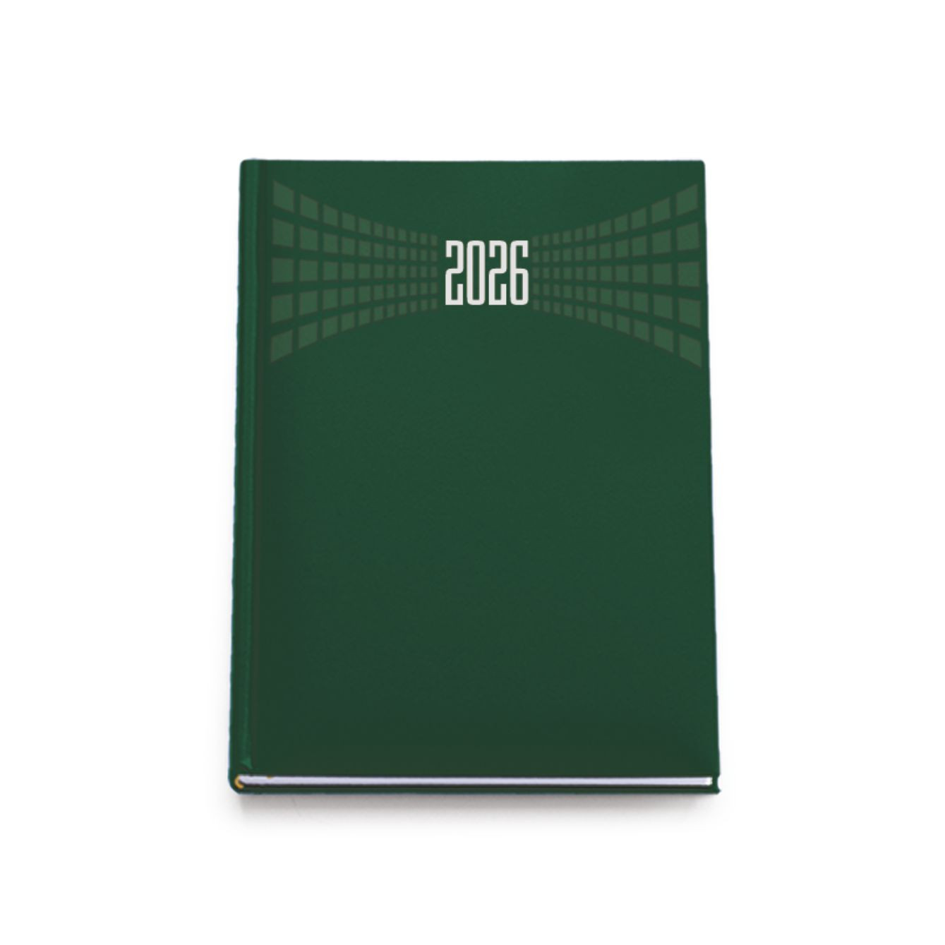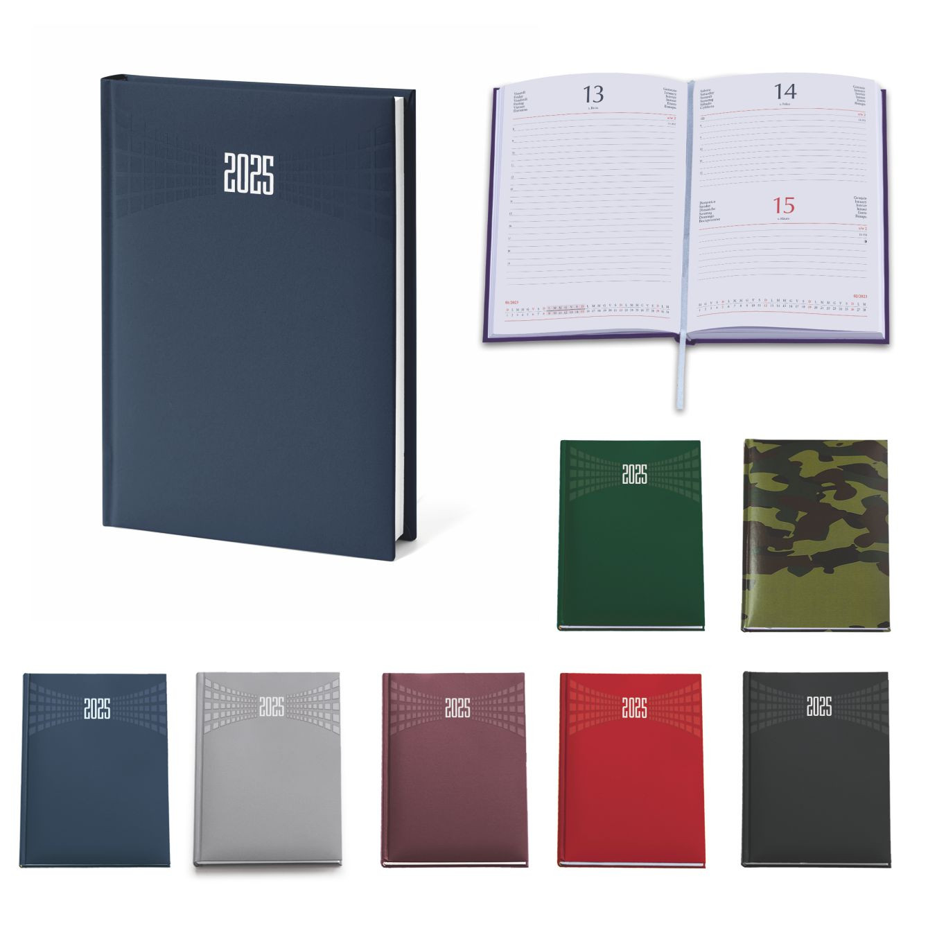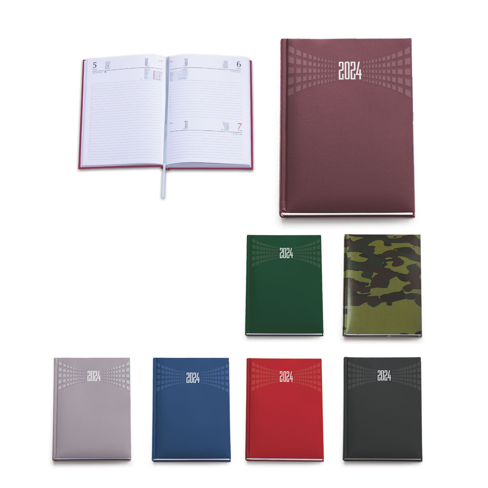 Agenda giornaliera in matra. 320 pag. Interno stampa 2 colori. Multilingue. Sabato e domenica abbinati, rubrica telefonica, cartina geografica, festività nel mondo. Colori: verde, blu, bordeaux, nero, rosso, grigio, camouflage. Dimensioni cm 15x21 Imballo: 20xcolore