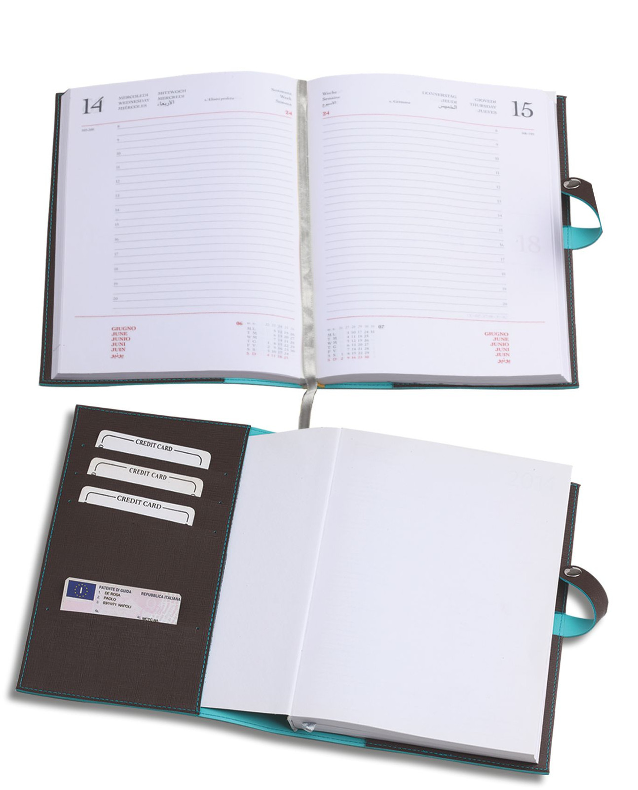 Agenda similpelle. 320 pag. Varie tasche p/card. Interno mobile giornaliero (15x21). Stampa 2 colori. Multilingue. Rubrica telefonica. Carta bianca. Colori: blu, nero, bordeaux, tortora. Confezione in astuccio Dimensioni cm.16x22