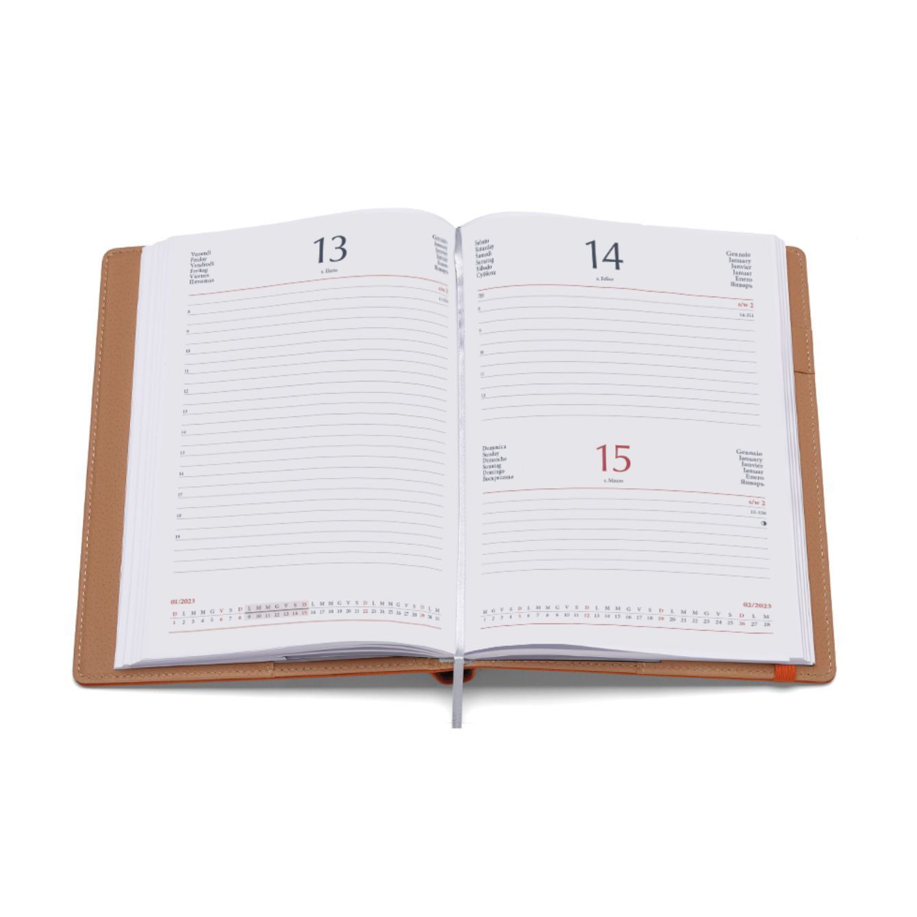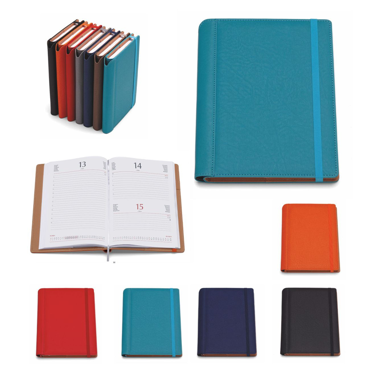Agenda Pu termovirante. 320 pag. Chiusa da elastico. Interno mobile giornaliero (15x21). Stampa 2 colori. Multilingue. Sabato e domenica abbinati, rubrica telefonica. Carta bianca 60gr usomano. Colori: arancio, marrone, grigio, turchese, rosso, blu, nero. Confezione in astuccio. . Dimensioni cm. 17x22 Imballo: 30xcolore