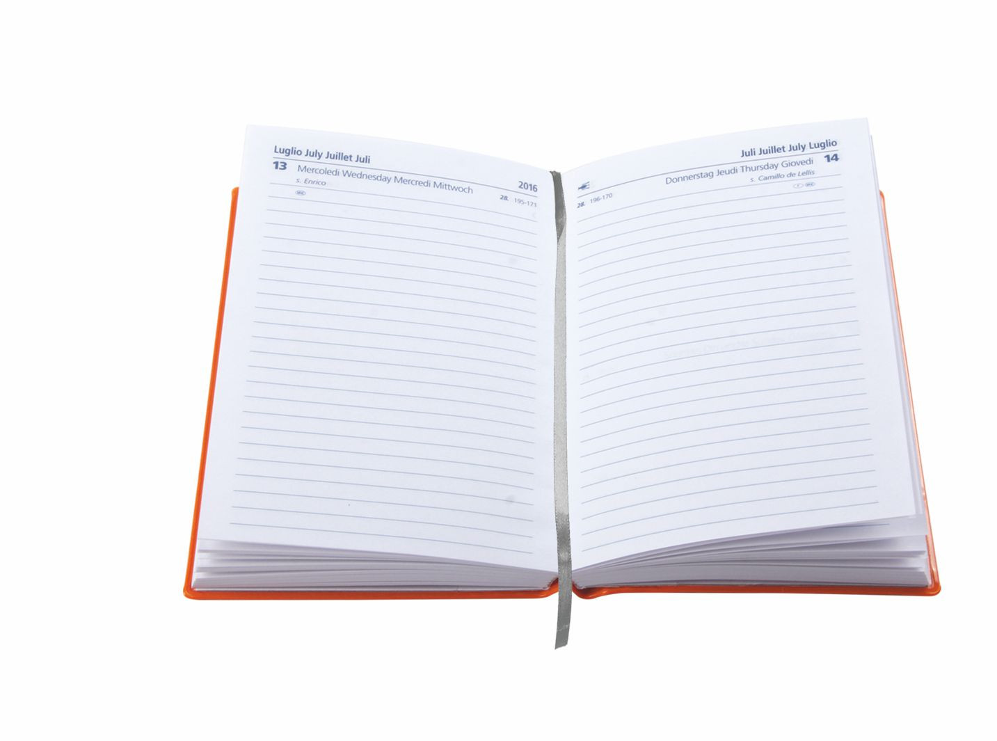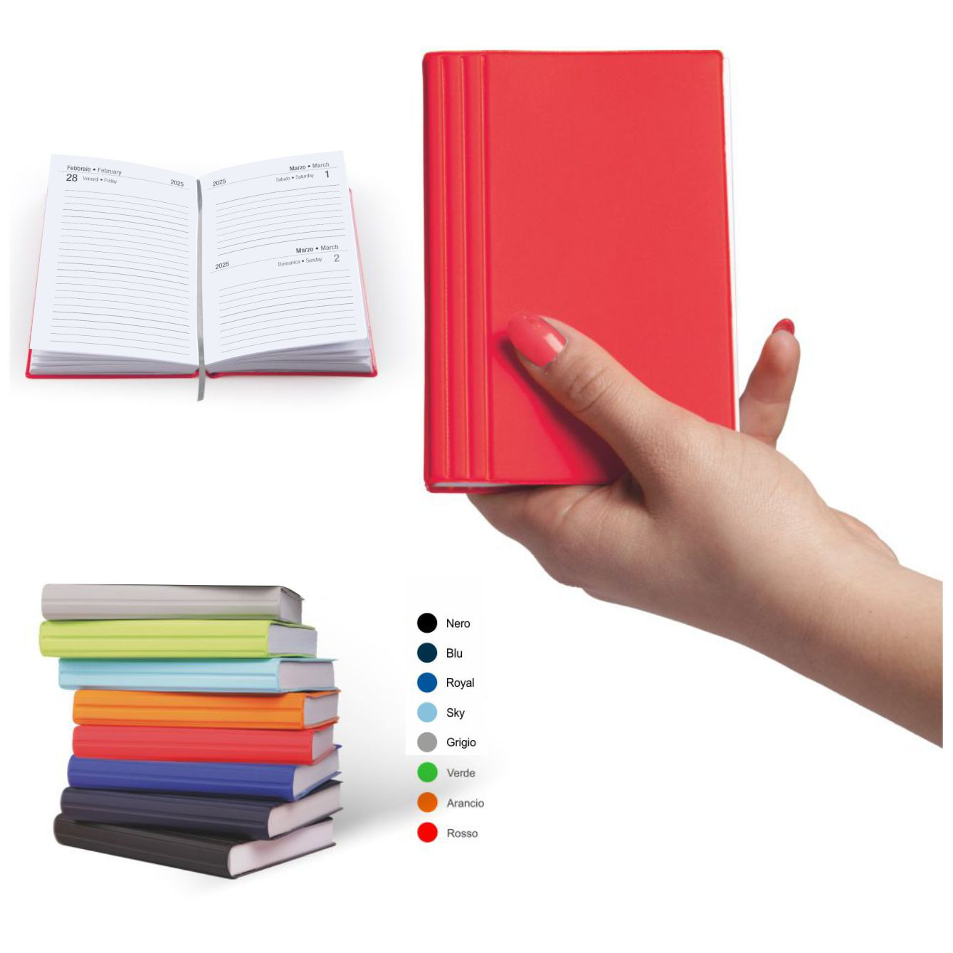Agenda pocket in tam. 326 pag. Interno mobile giornaliero (9x13). Stampa 2 colori. Multilingue. Sabato e domenica abbinati, rubrica telefonica. Colori: arancio, rosso, nero, blu, sky, verde, royal, grigio, bianco. Fornita senza astuccio. . Dimensioni cm 9x13