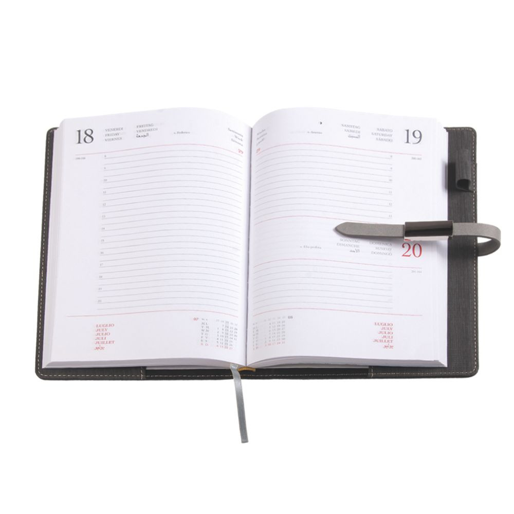 Agenda giornaliera Pu termovirante. 320 pag. Chiusa da linguetta con piastrina in metallo calamitato. Vano porta penna. Interno mobile giornaliero (15x21). Stampa 2 colori. Multilingue. Sabato e domenica abbinati. Carta bianca, rubrica telefonica, dati personali. Colori: arancio, rosso, marrone, blu, grigio. Confezione in astuccio. Dimensioni cm. 16x21,5 Imballo: 30xcolore