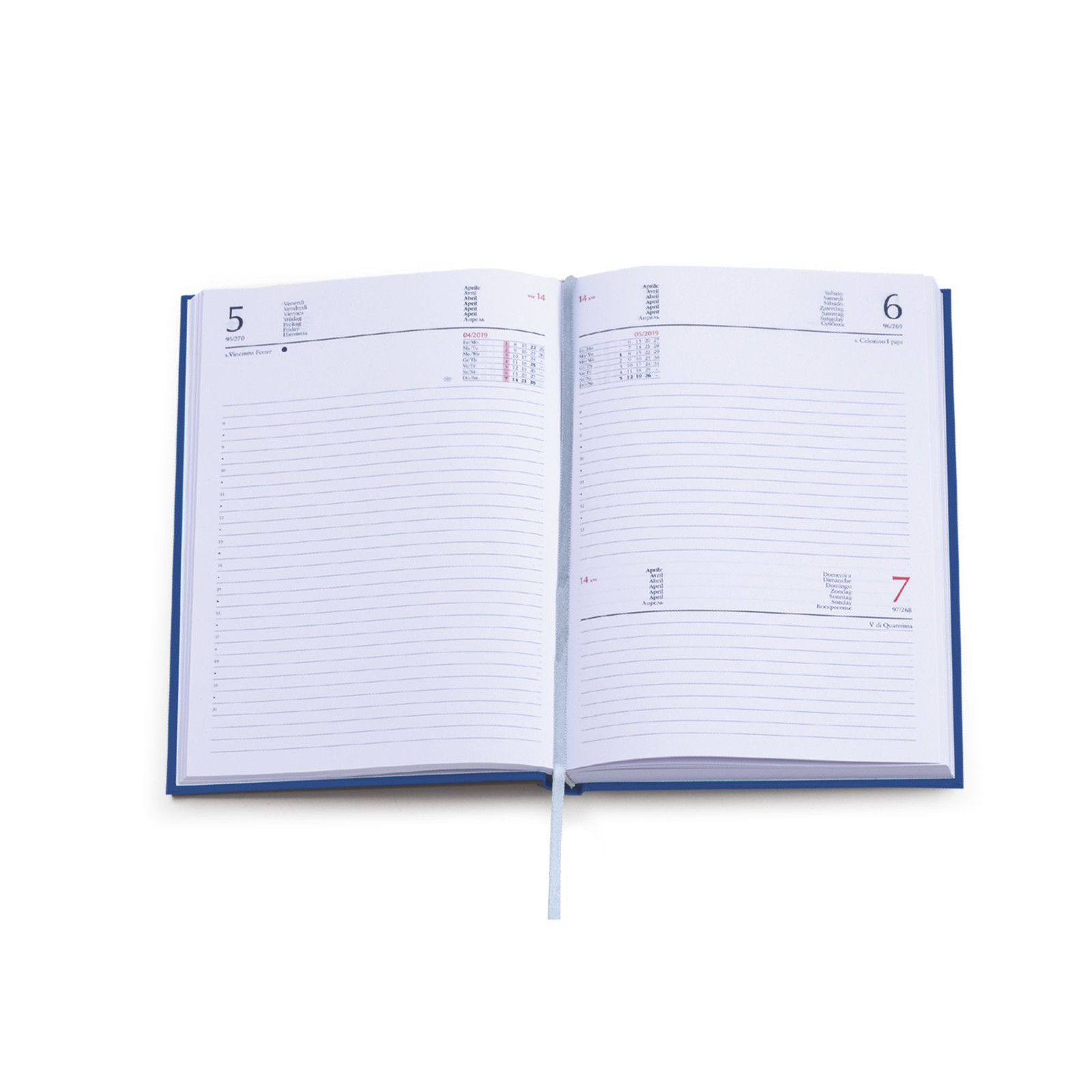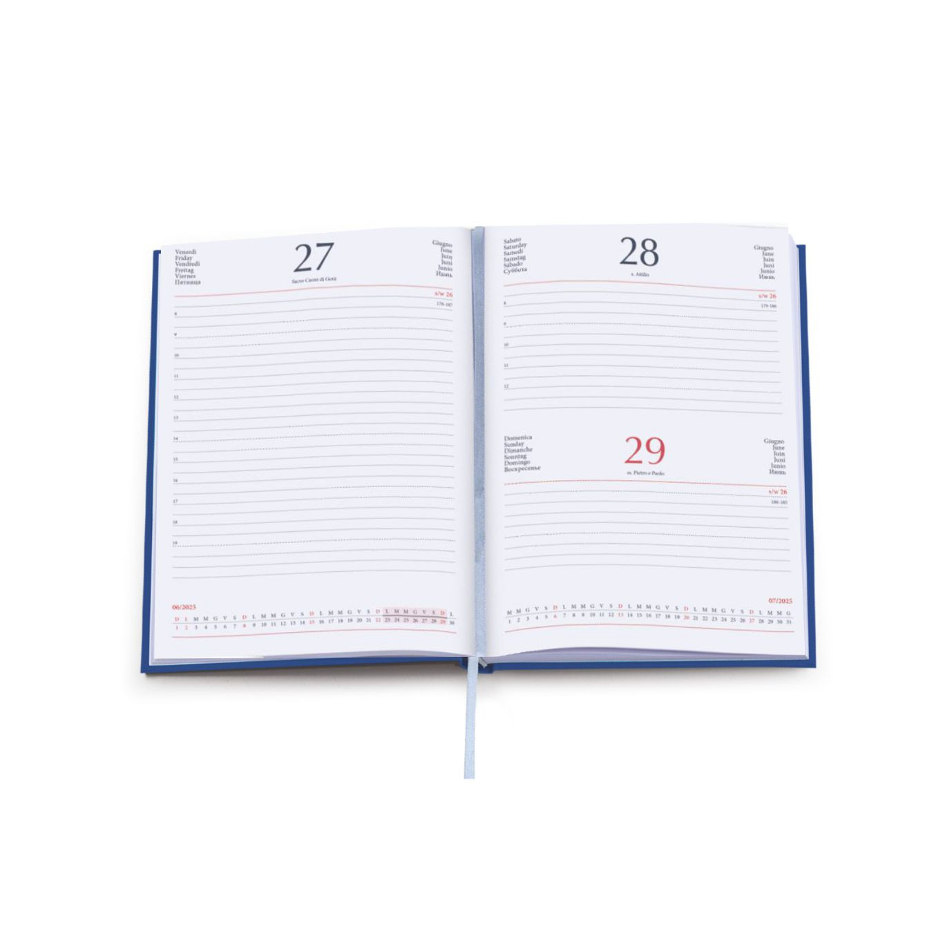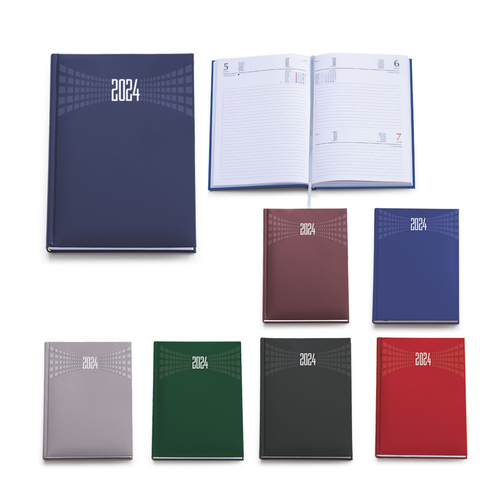 Agenda giornaliera in matra. 320 pag. Interno stampa 2 colori. Multilingue. Sabato e domenica abbinati, rubrica telefonica, cartina geografica. Colori: blu, verde, bordeaux, nero, rosso, grigio, royal. Dimensioni cm17x24