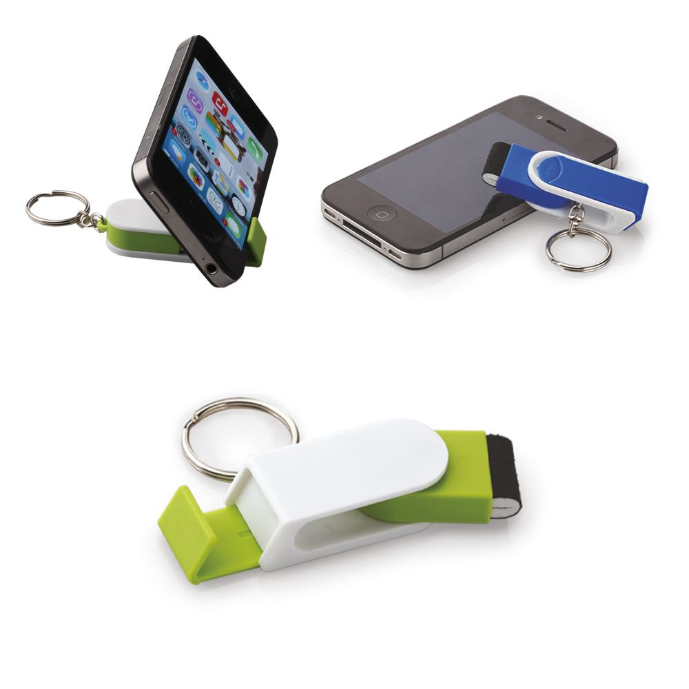 Portachiavi supporto cellulare-pulisci schermo. Materiale: plastica. Colori: rosso, nero, verde, blu. Confezione in polybag. Dimensioni cm.4,5x1,5 Imballo: 1000xcolore