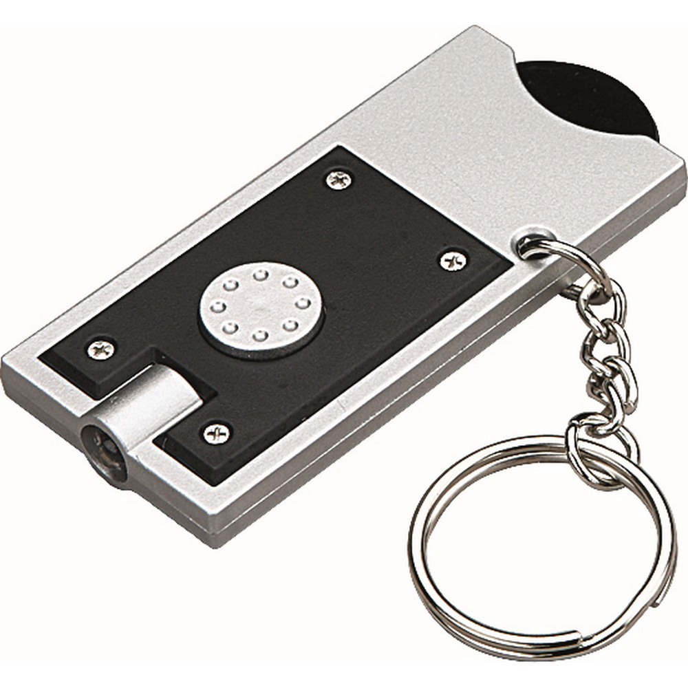 Portachiavi gettone con led in plastica. Colori: nero, blu, rosso, arancio, verde. Confezione in polybag. Dimensioni cm 7x3 Imballo: 200xcolore