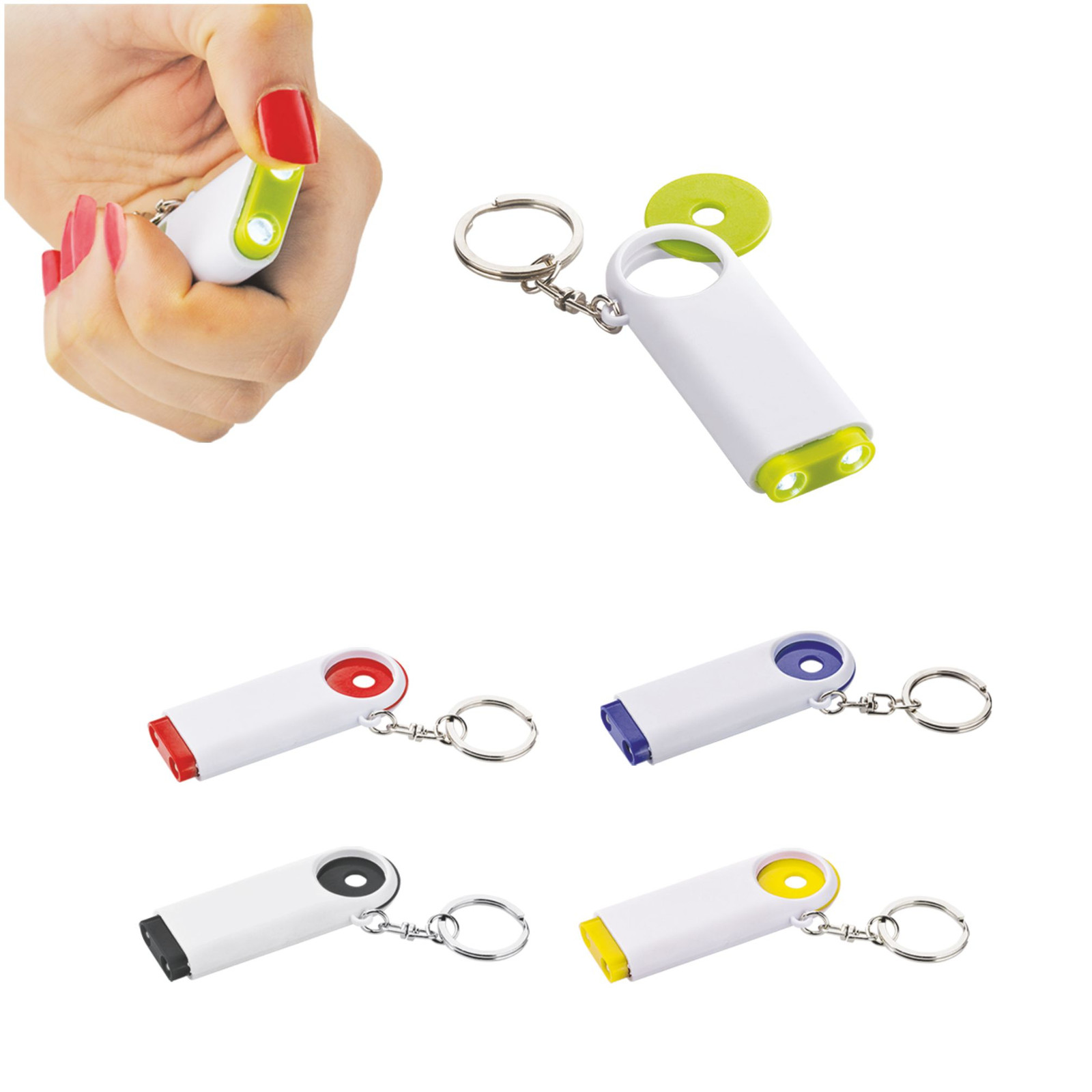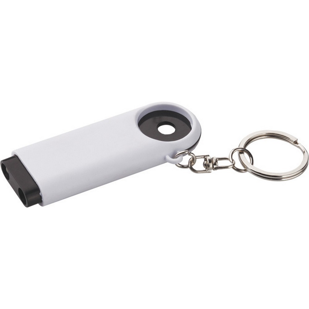 Porta chiavi-gettone con led in plastica. Confezione in polybag. Colori: rosso, blu, nero, verde, arancio, giallo. Confezione in polybag. Dimensioni cm.7x2,5 Imballo: 500xcolore