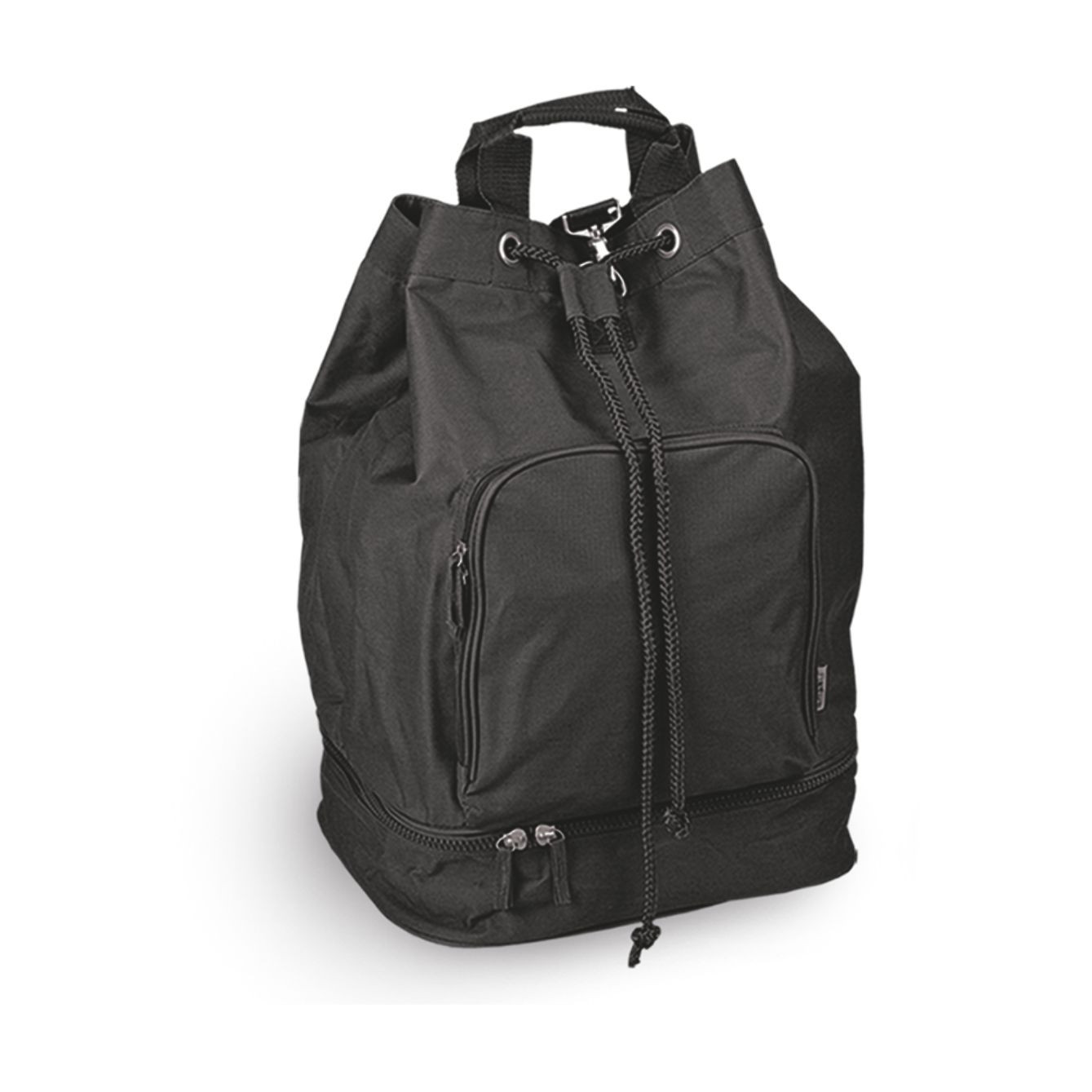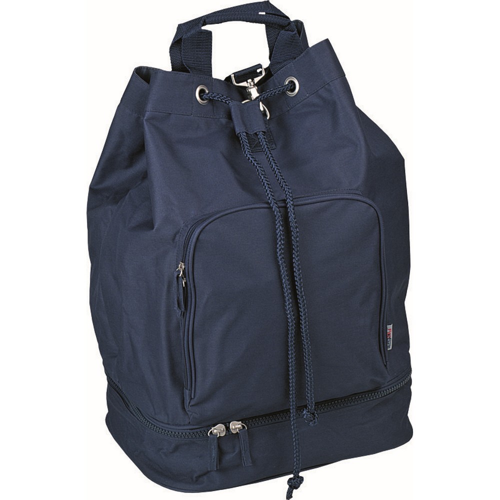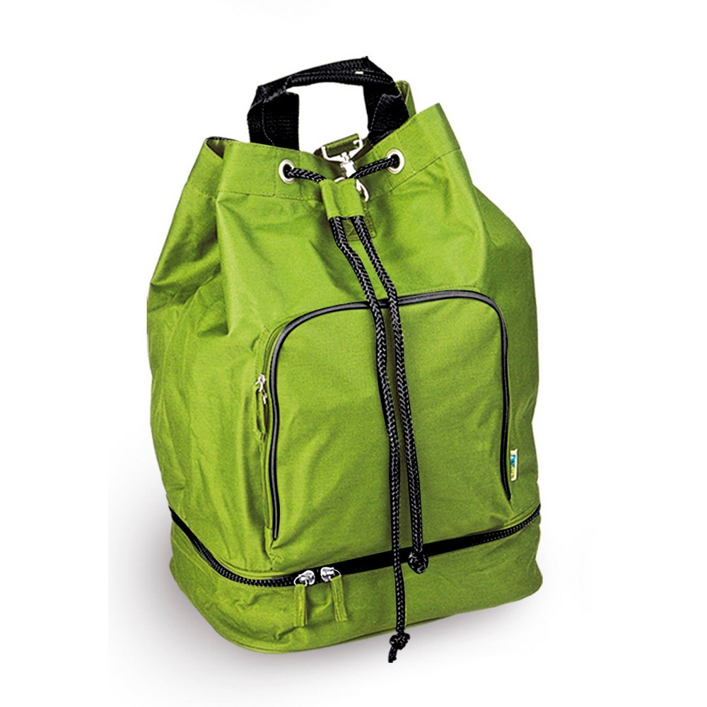 Borsa zaino in poliestere 600D.Tasca anteriore con zip. Chiusura con laccio regolabile. Corredata di manici e tracolle salva spalle, piedini antiscivolo, fondo con zip. Confezione in polybag. Colori: blu, nero, rosso, verde, fuxia. Dimensioni cm 36x53x25 Imballo: 20xcolore