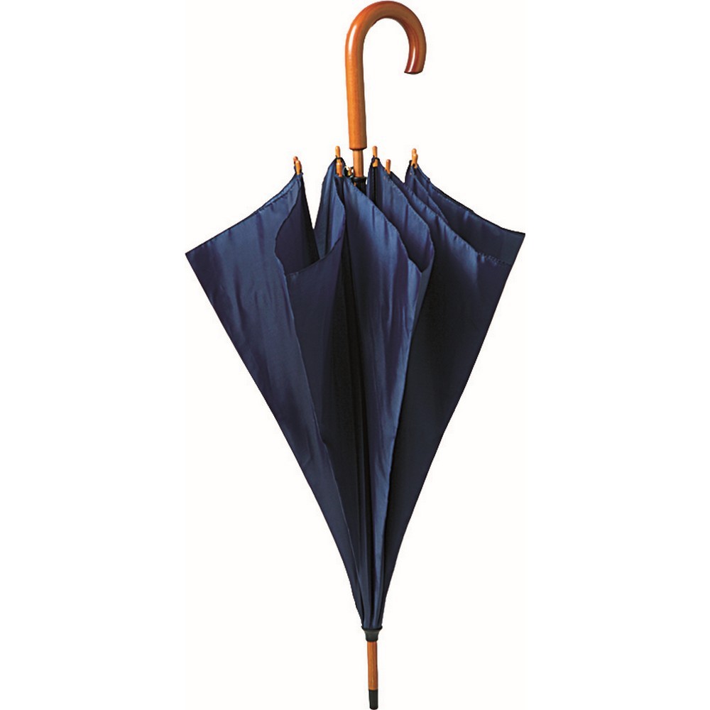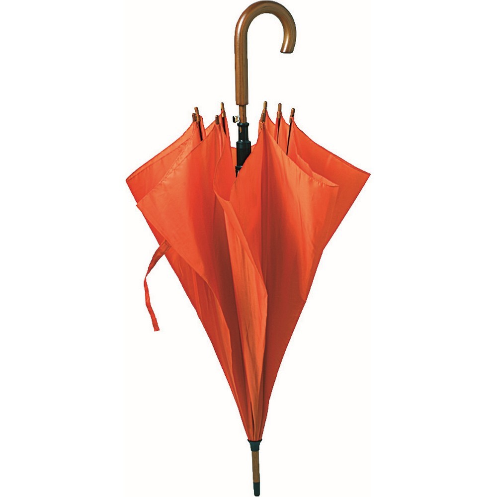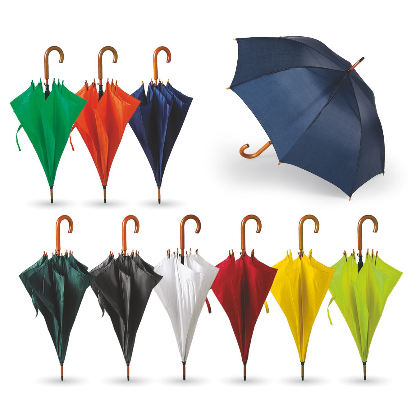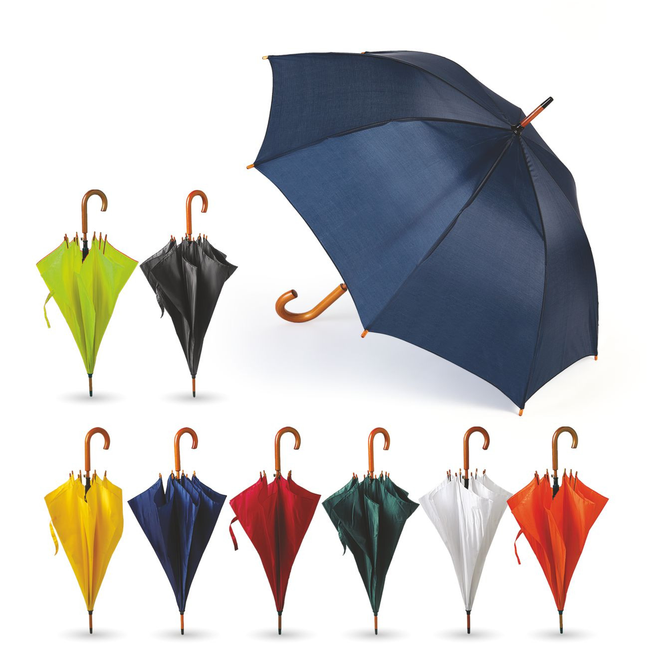 Ombrello scatto automatico. Poliestere 190T.Manico curvo e puntale in legno. Colori: giallo, blu, verde scuro, bianco, bordeaux, arancio. Dimensioni Ǿ cm.105 h. cm.89 Imballo: 60xcolore