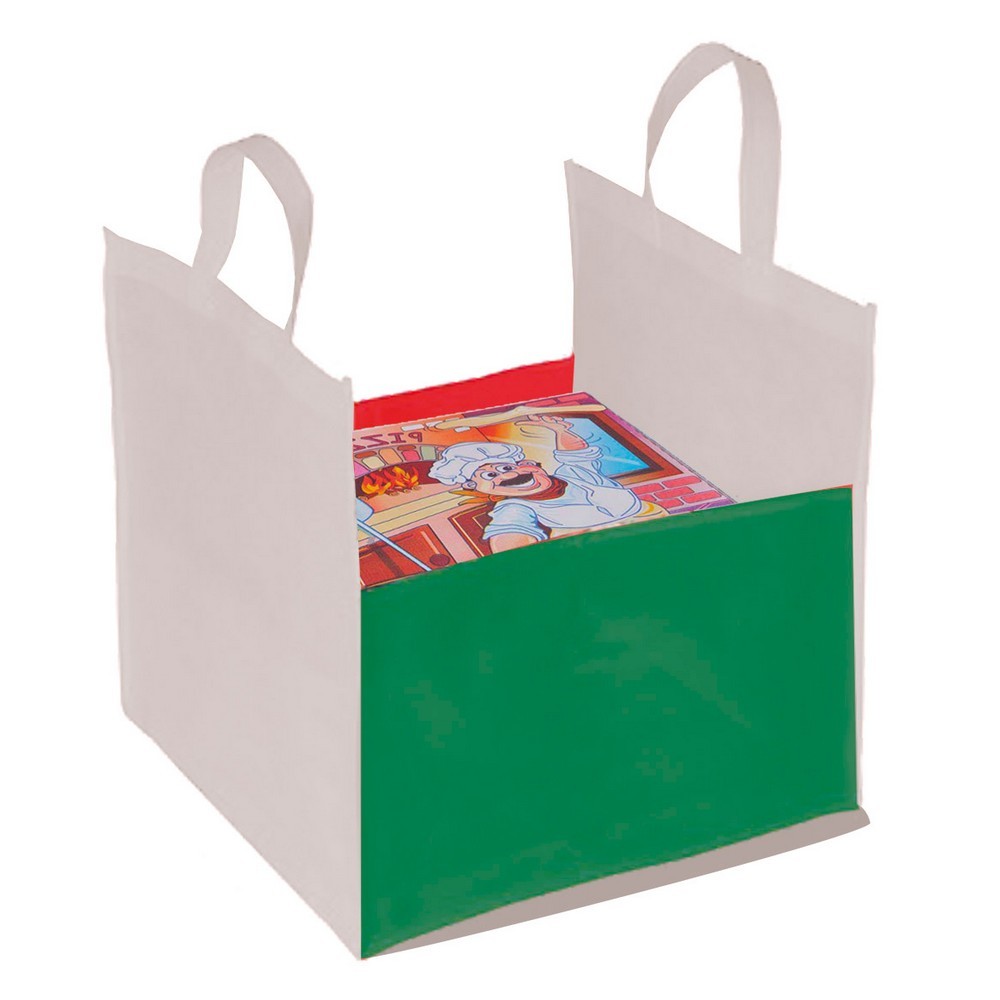Borsa pizza cucita in tnt. Capienza massima 5 scatole. Comodi manici e cordoncino di sicurezza. Colori: rosso, verde, tricolore, bianco. Dimensioni cm. 36,5x36x27 Imballo: 100xcolore