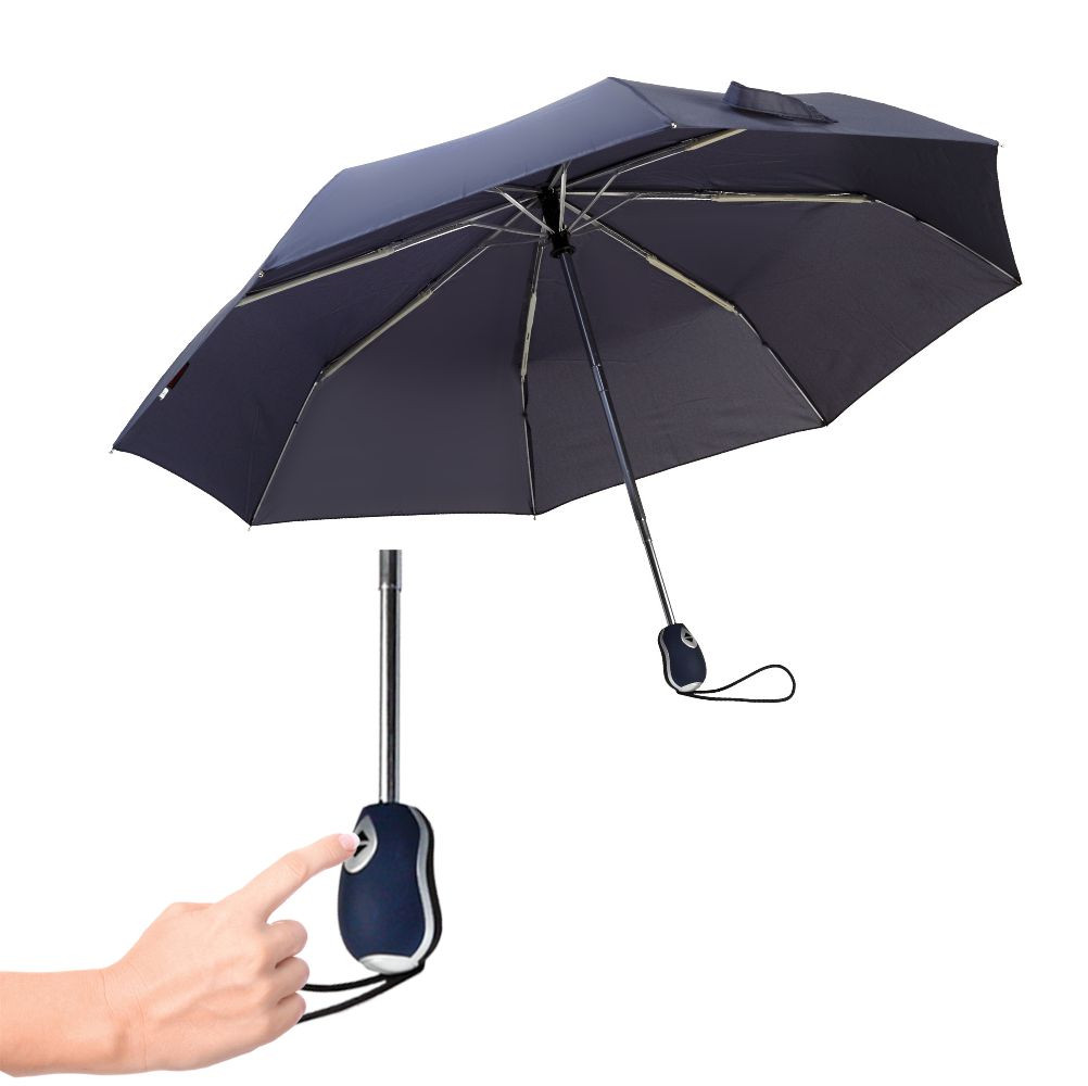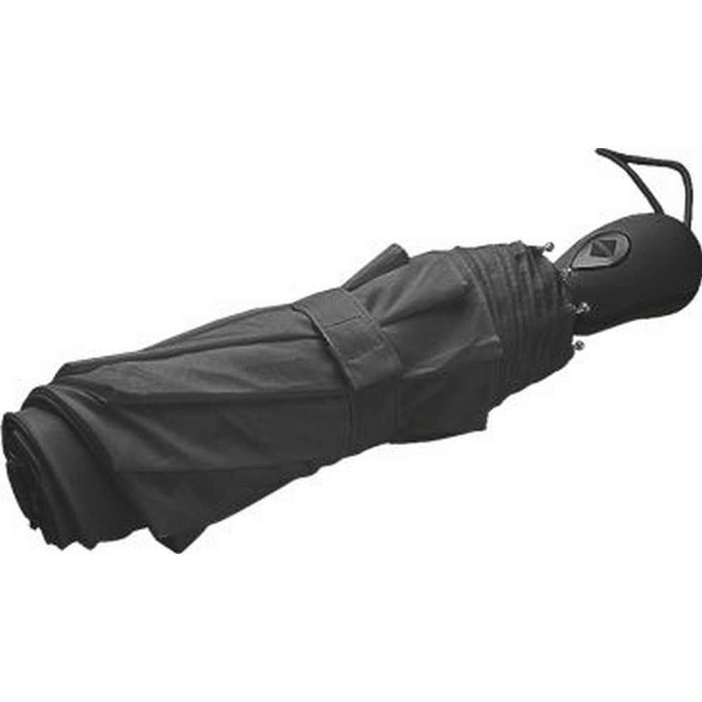 Ombrello pieghevole in poliestere 190T + pongee. Manico in plastica con pulsante automatico per facile apertura e chiusura. Confezione in custodia poliestere.8 stecche fiberglass. Colori: blu, bianco, nero. Dimensioni Ǿ cm.97 h.cm.56 Imballo: 48xcolore