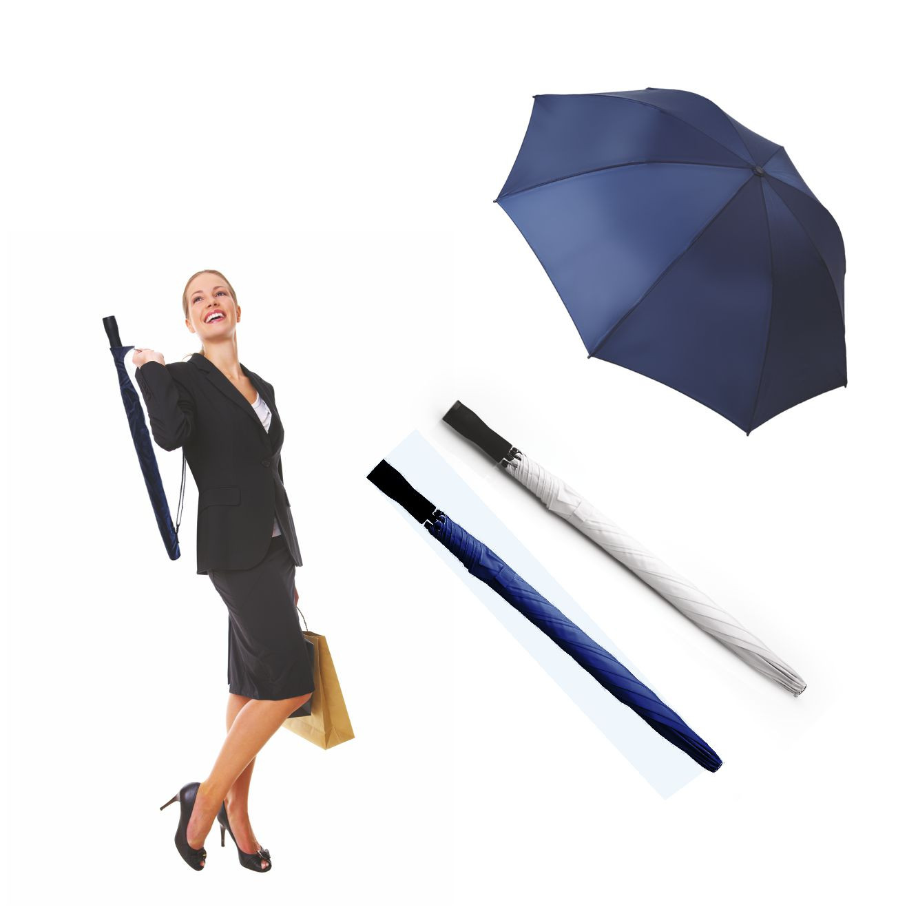 Ombrello manuale in poliestere 190T. Resistente al vento, asta in alluminio. Manico dritto con impugnatura in gomma piuma. Custodia in nylon, corredata di tracolla regolabile per facile tra-sporto a spalla. 8 stecche fiberglass. Colori: blu, bianco. Dimensioni Ǿ cm.92 h. cm.66 Imballo: 60xcolore