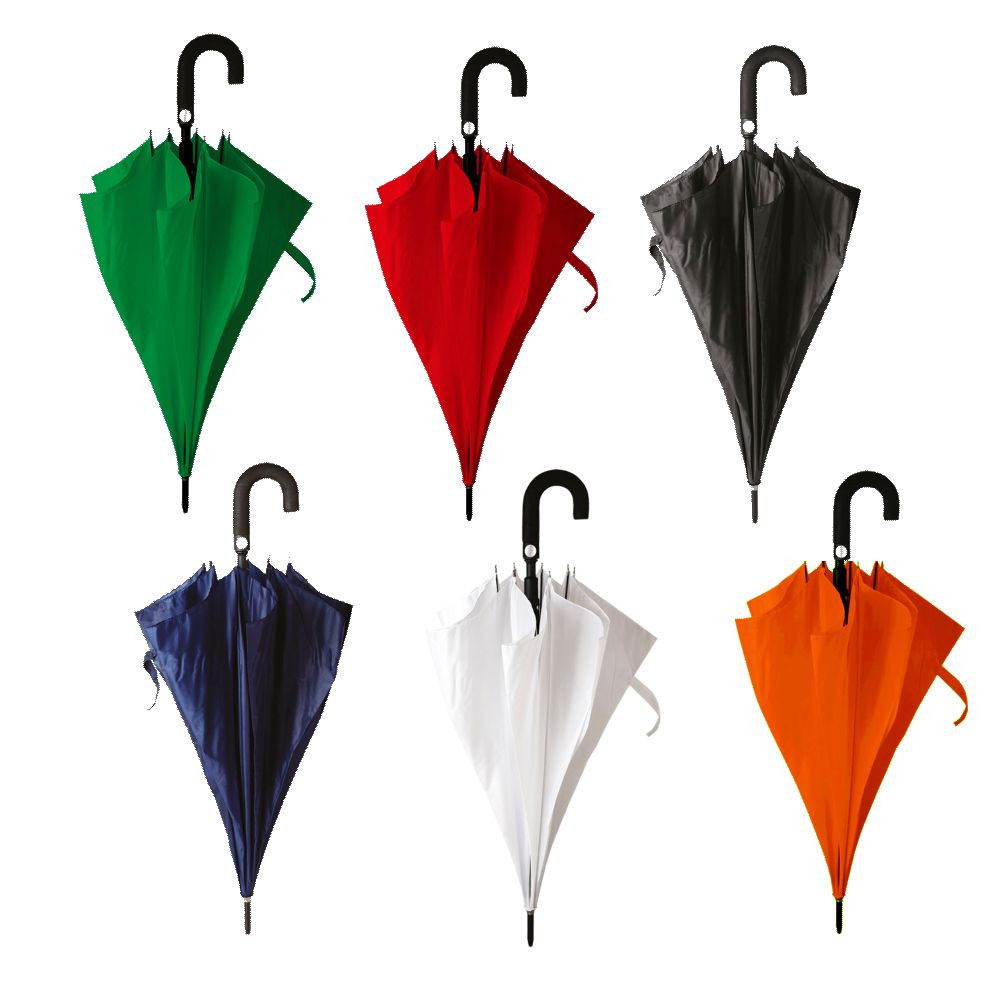 Ombrello scatto automatico in poliestere 190T. Resistente al vento, asta in alluminio. Manico curvo con pulsante automatico per facile apertura e chiusura. Puntale in alluminio.8 stecche fiberglass Colori: blu, arancio, bianco, nero, rosso, verde. . Dimensioni Ǿ cm105 h. cm. 90 Imballo: 48xcolore