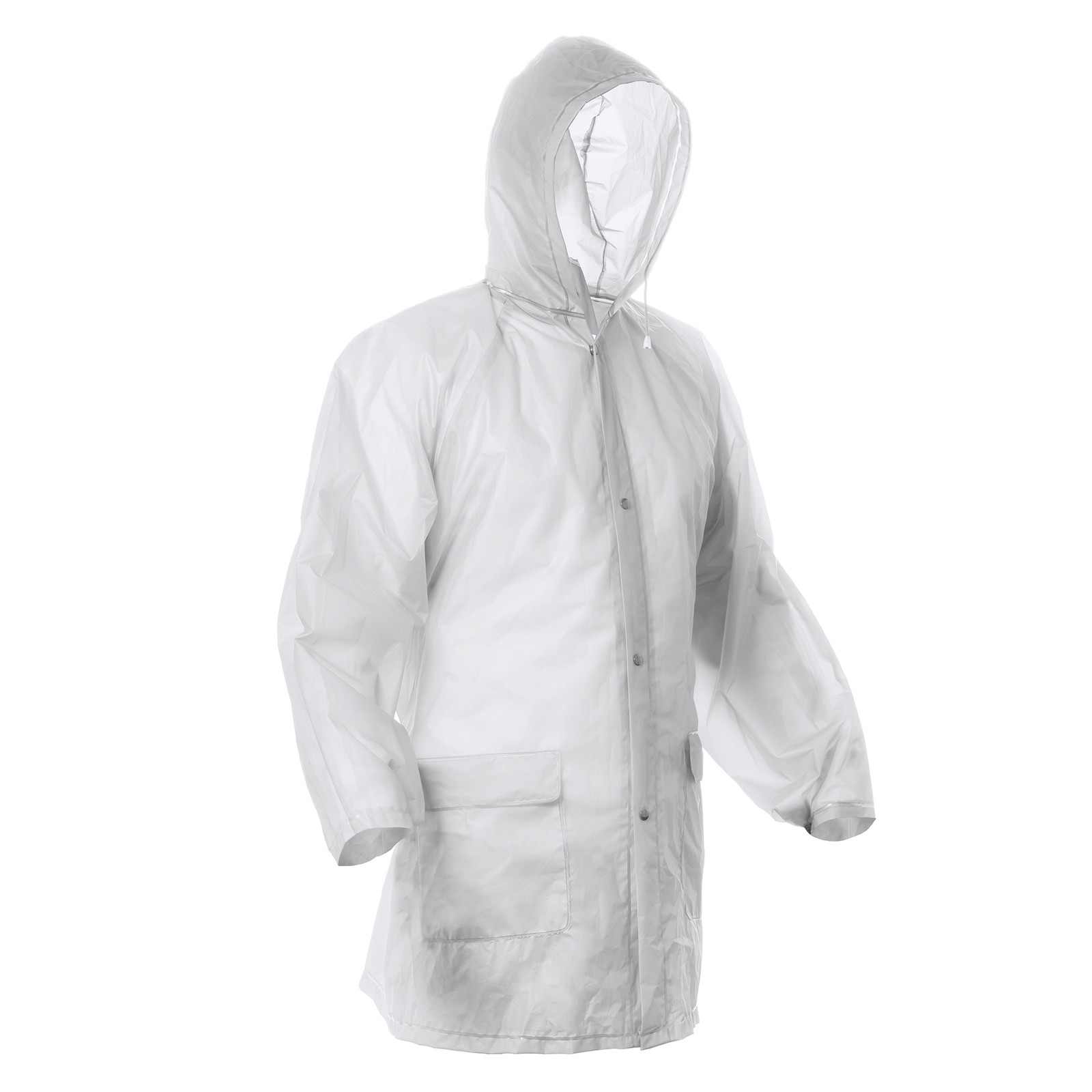 Impermeabile con finiture termosaldate, chiusura centrale con 4 bottoni, tasche laterali con patta, polsini con bottone, cappuccio regolabile con coulisse. Custodia inclusa. In EVA e poliestere. Taglia unica cm 86x72. Confezione in custodia. Imballo: 50pz.