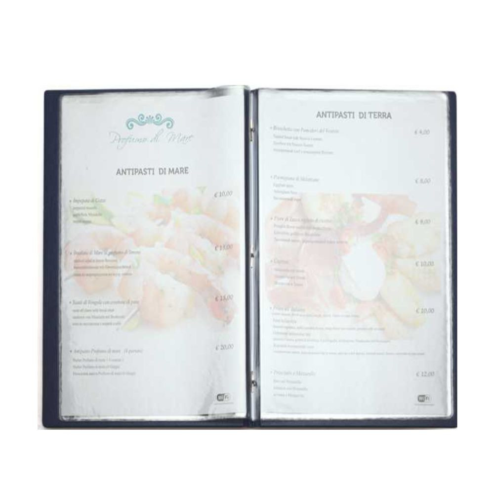 Porta menù in PU termovirante. Adatto per stampa a caldo. 8 buste bifacciali. Colori: nero, rosso, blu, bianco, marrone. Dimensioni cm. 16x26 Imballo: 20xcolore