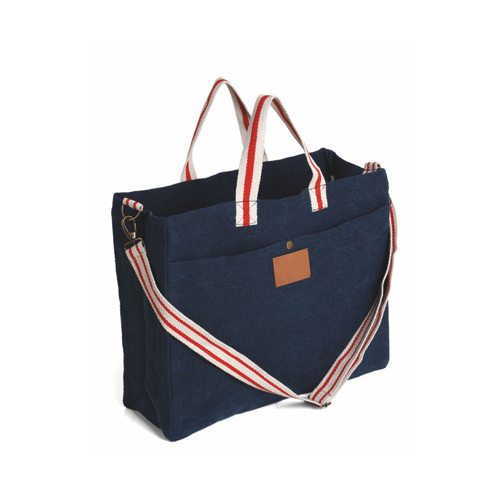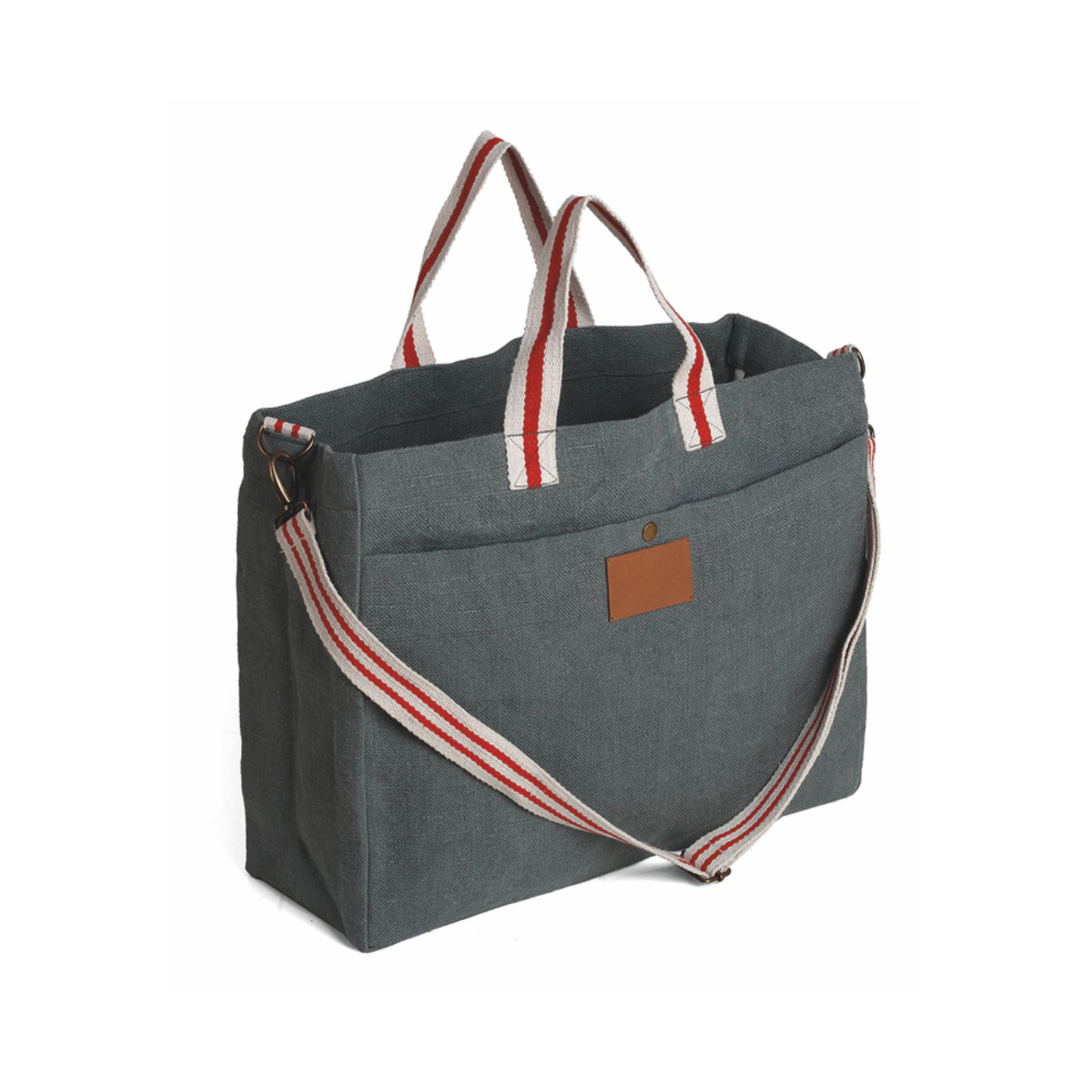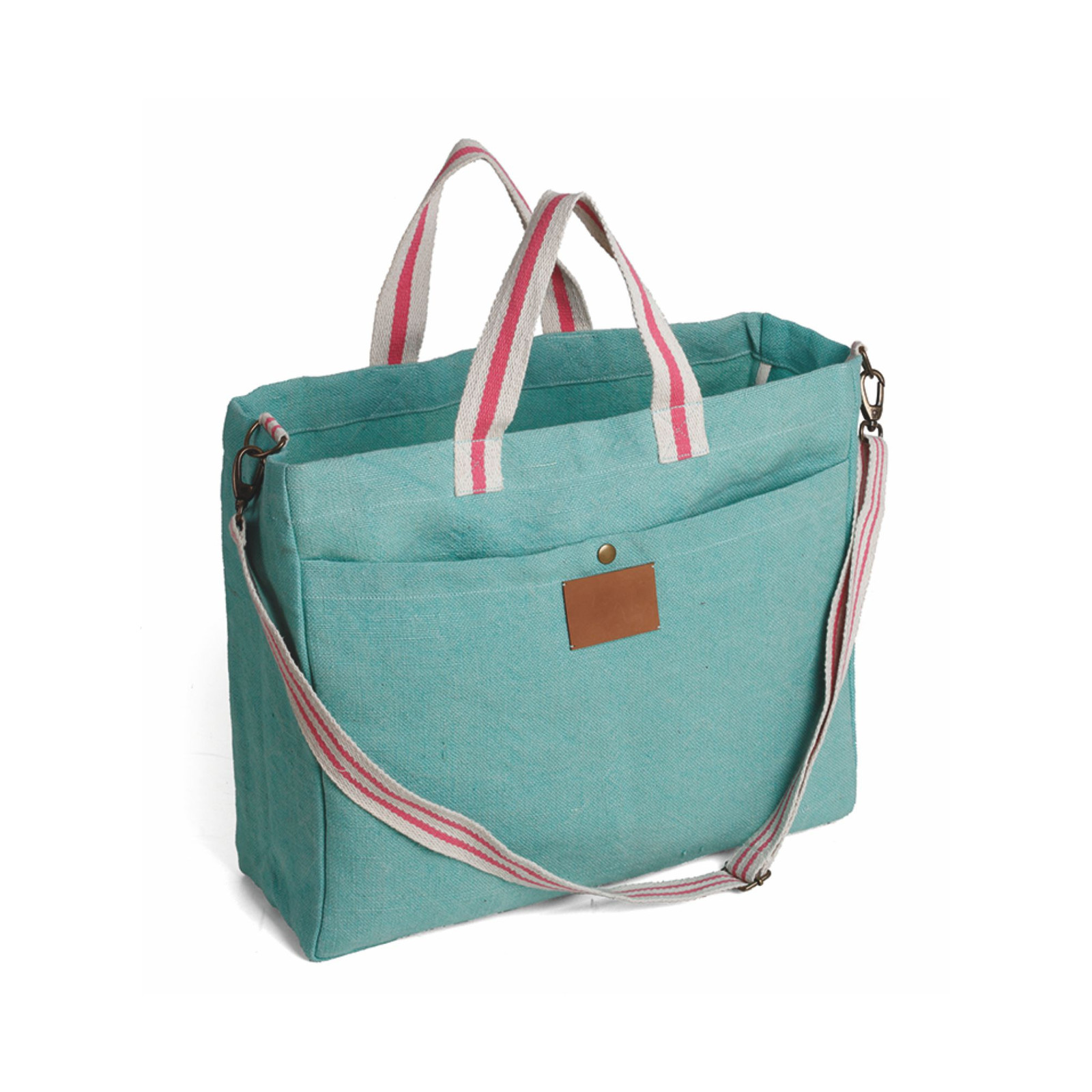 Borsa in soft juta e cotone, tasca frontale, manici in corda cm 4x48, tracolla regolabile cm 4x132. Dimensioni: cm 46x39x15. Imballo: 10pz.