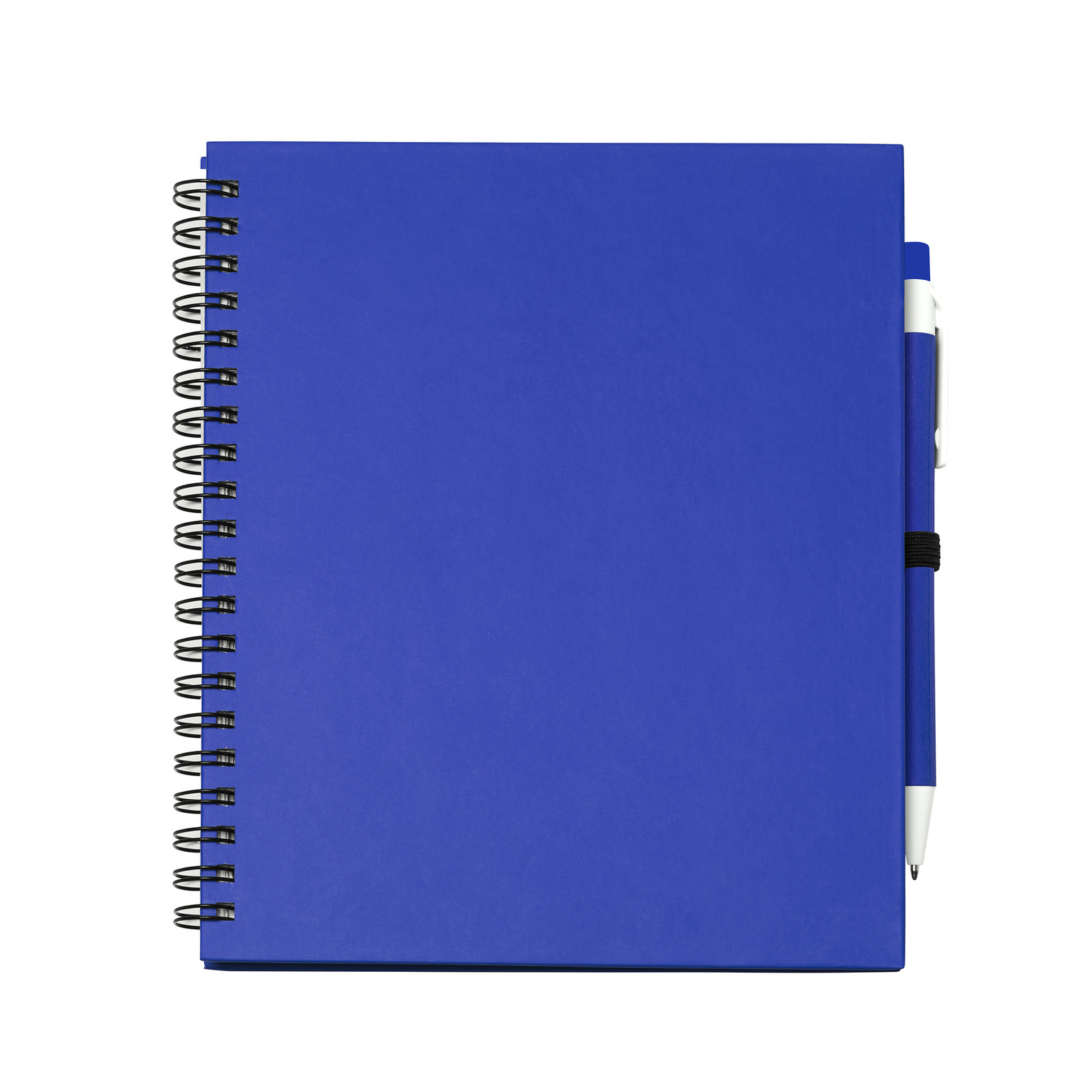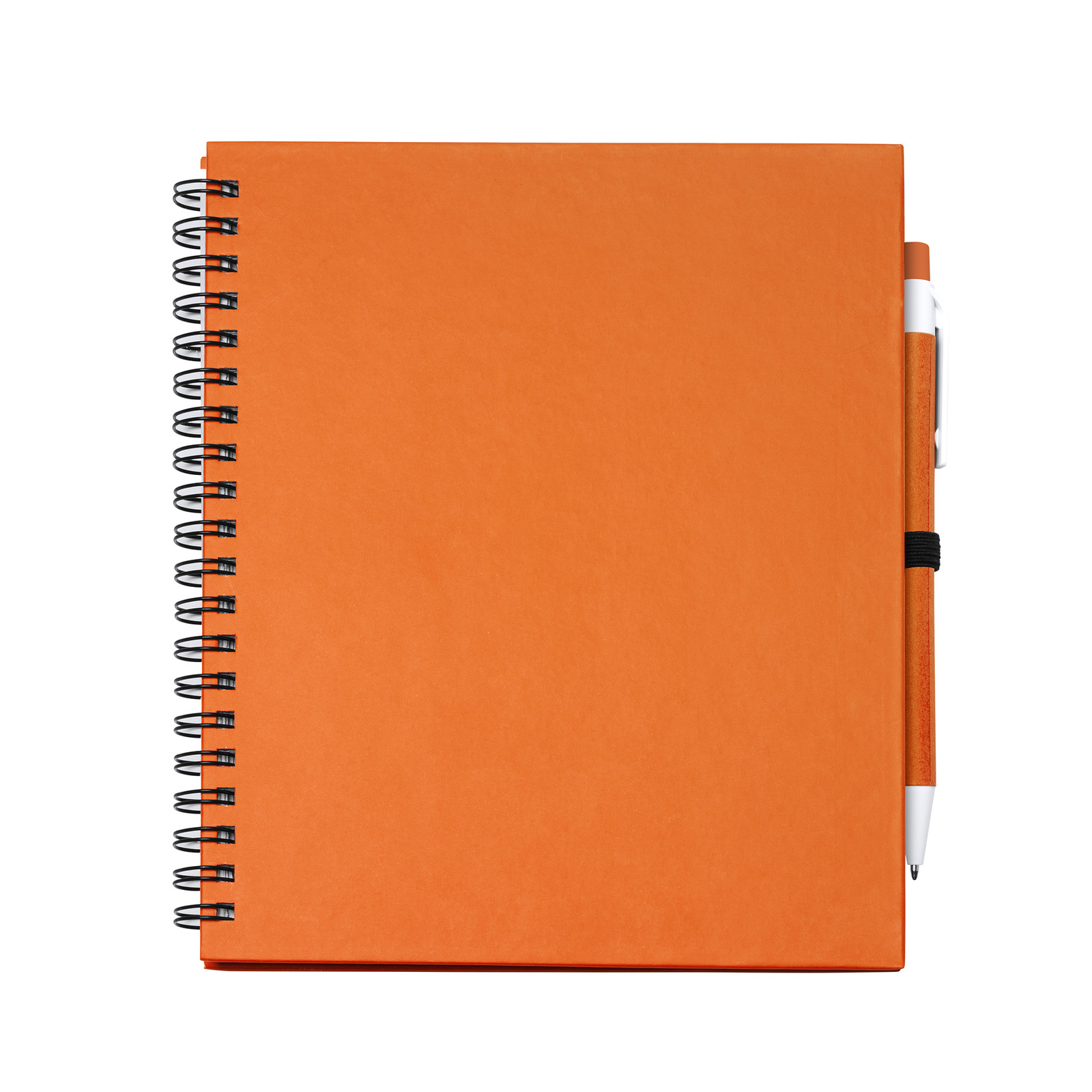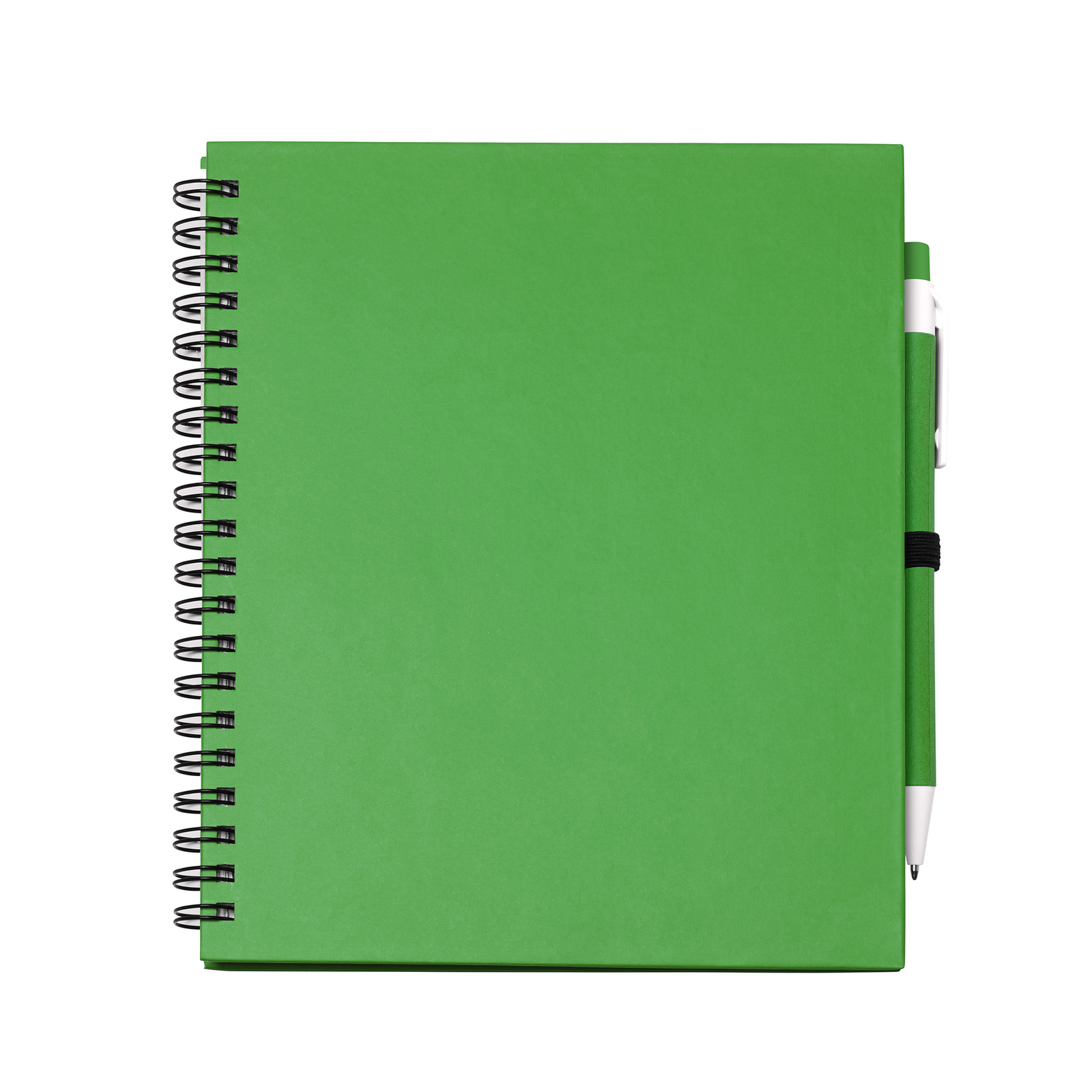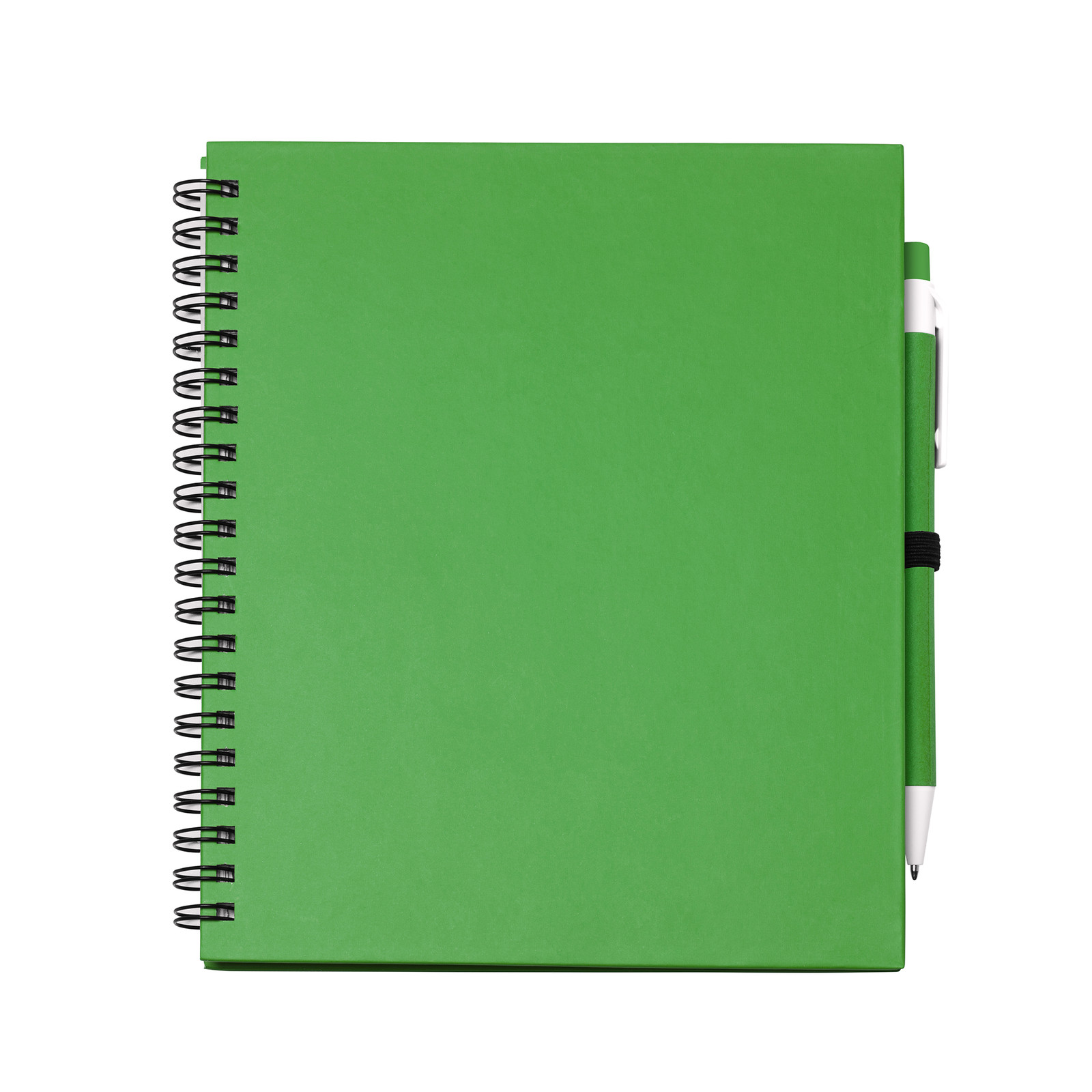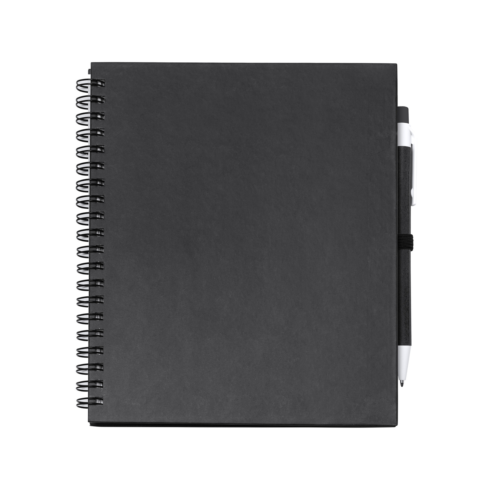 Quaderno ad anelli a spirale con fogli bianchi e portapenne. Copertine rigide e penna in cartone riciclato abbinata. 70 fogli. Dimensioni: cm 15x1,9x17,2