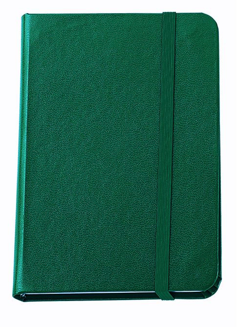 Blocco notes con elastico. Pvc. Interno composto da 100 fogli /240 pagine. gr.70 carta bianca. Confezione in polybag. Colori: verde, bianco, nero, rosso, blu, royal, arancio, oro, silver. . Dimensioni cm.13,5x20,5 Imballo: 50xcolore
