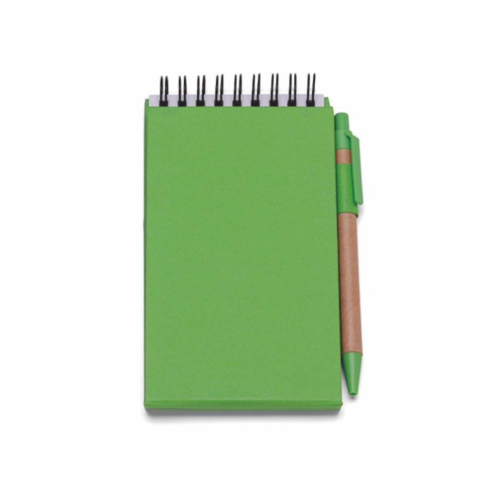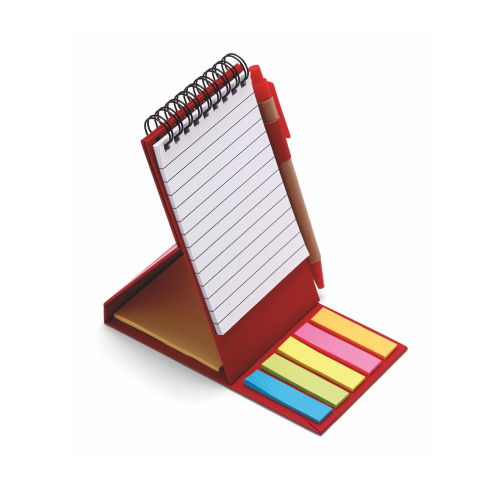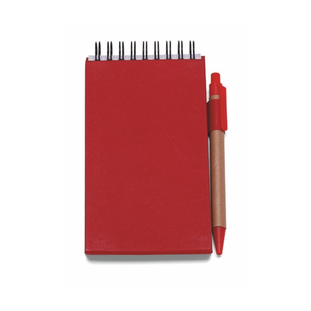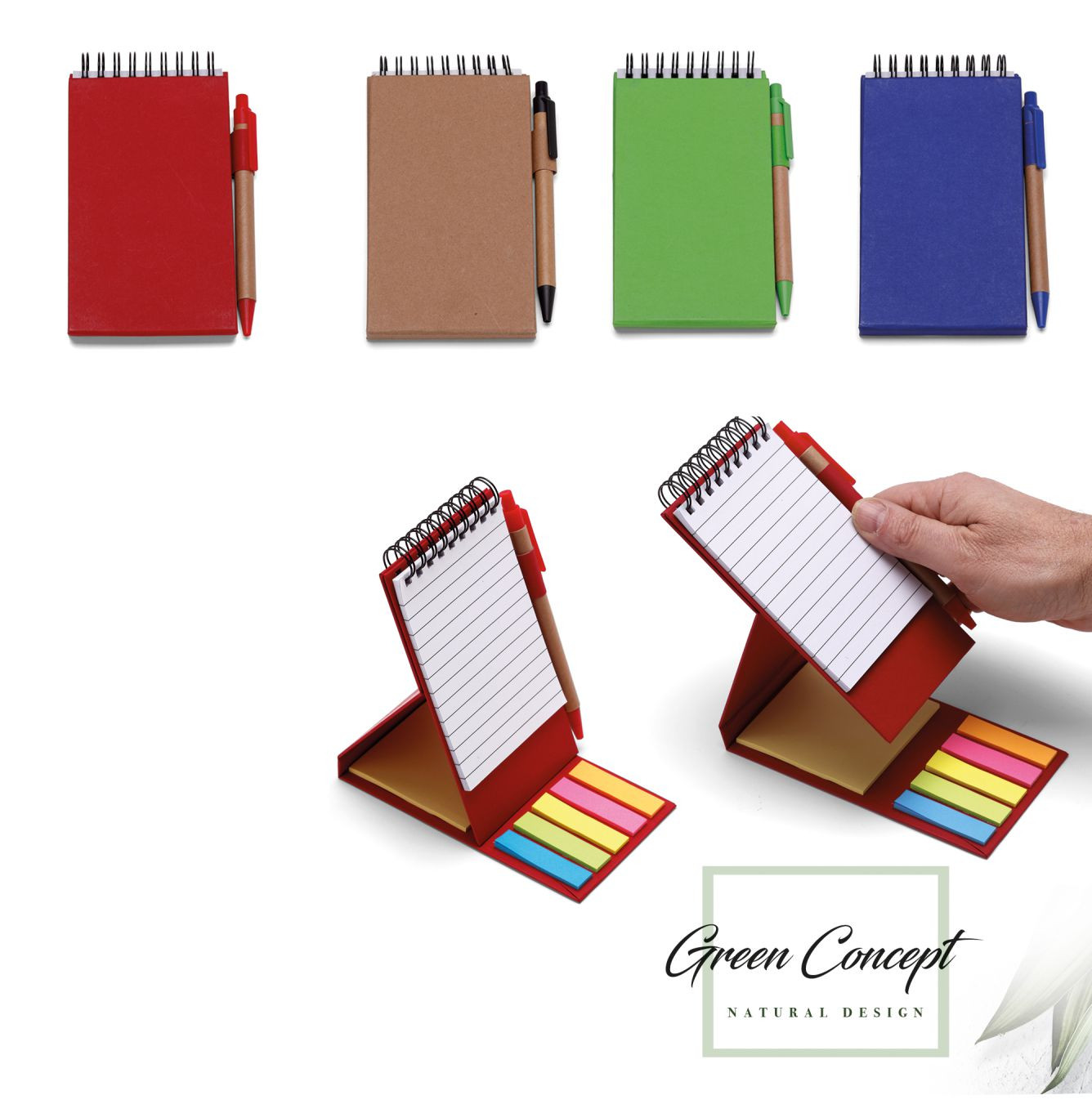 Blocco notes “Eco paper”. Carta 70gr. 70 fogli a righe. Corredato di: 25 post-it per colore, pen-na refill nero. Colori: rosso, avana, verde, blu. Confezione in polybag. . Dimensioni cm. 8,5x15 Imballo: 100xcolore