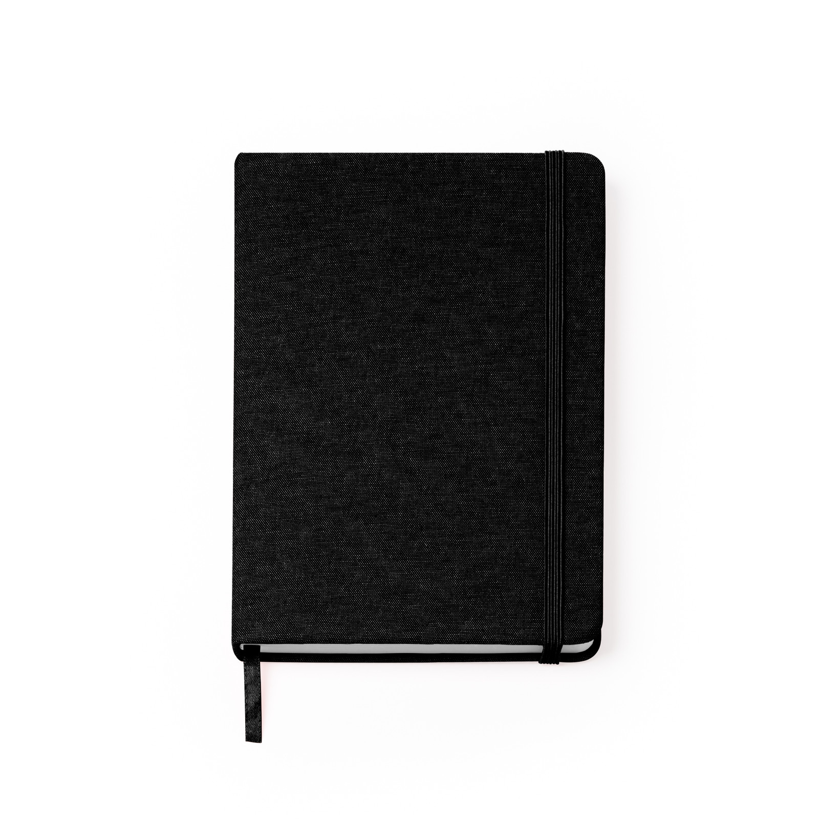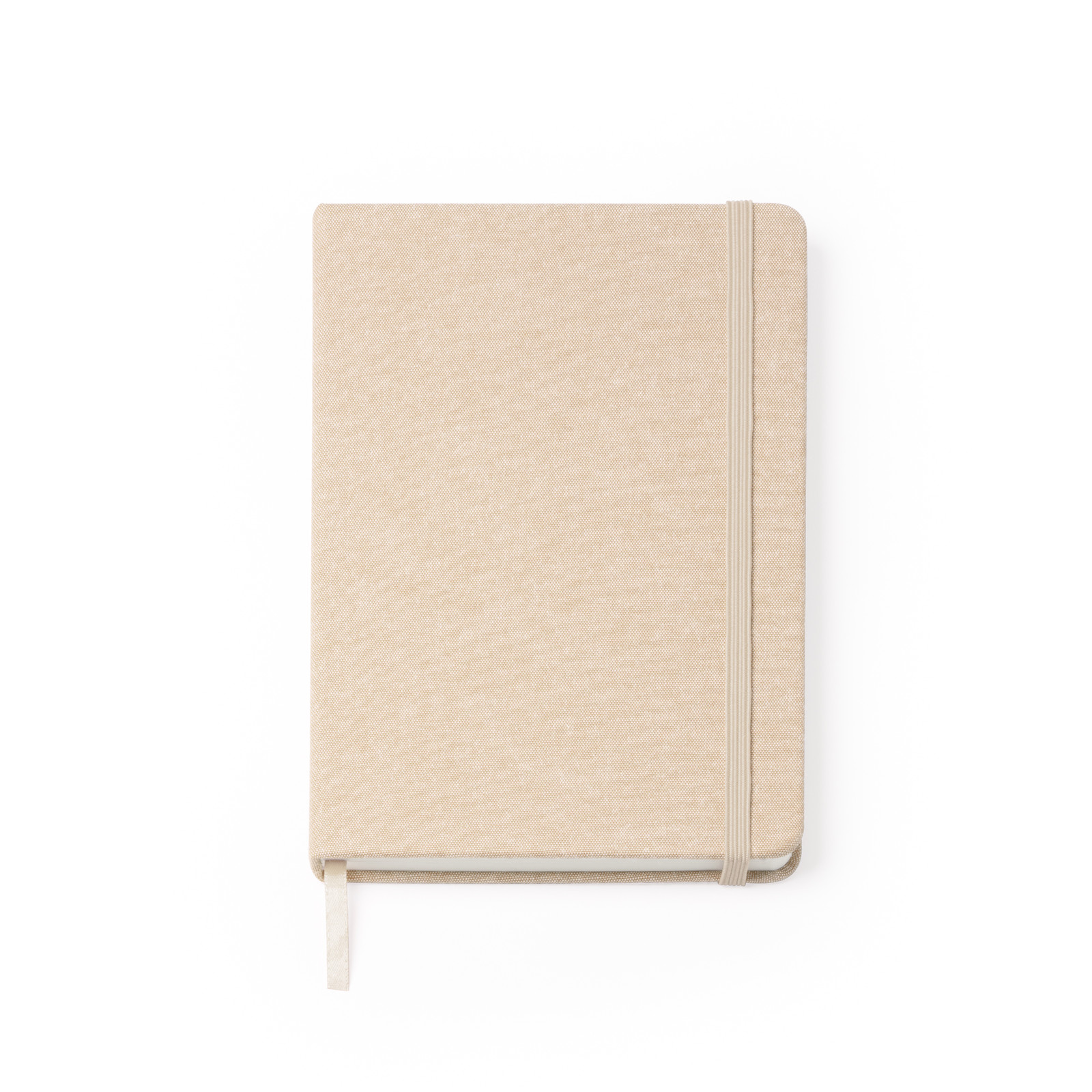Quaderno A5 con copertina in cotone. Segnapagina ed elastico. 100 fogli bianchi. Dimensioni: cm 14x21x1,5