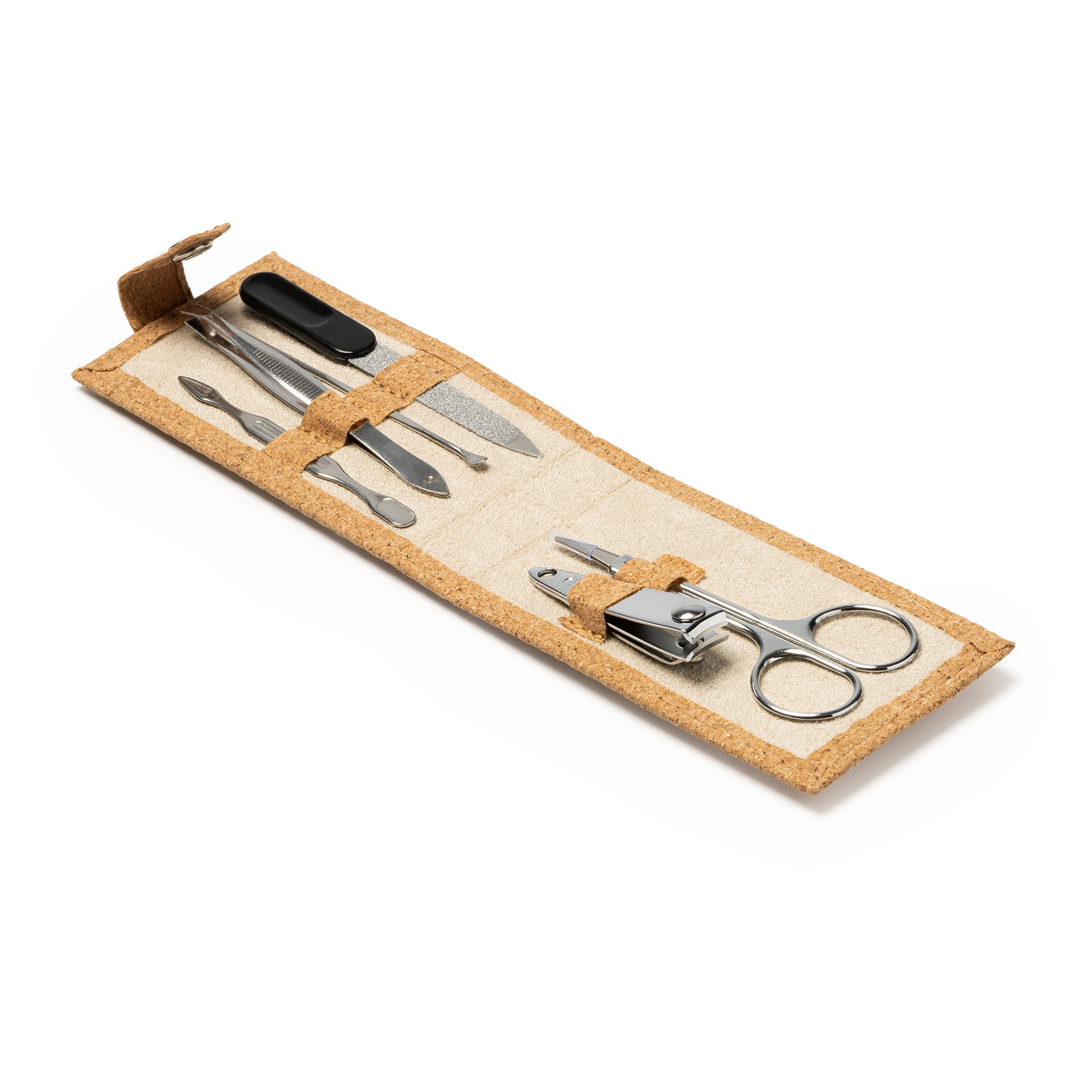 Kit manicure con custodia in sughero e chiusura a scatto. Forbici, pinzette, tagliaunghie, lima e taglia cuticole. In acciao inossidabile. Dimensioni: cm 11x6x2.Confezionato in astuccio. Imballo: 200pz.
