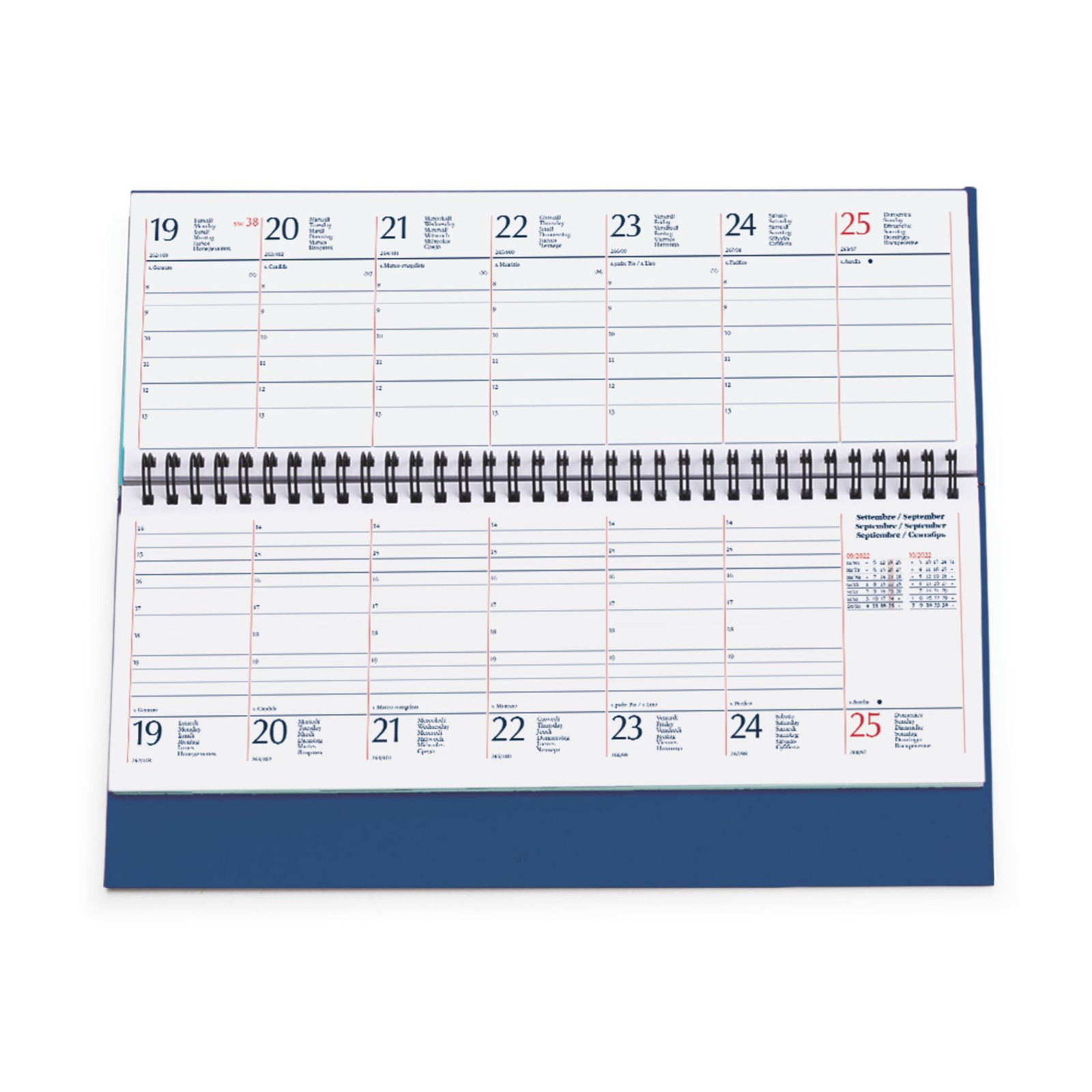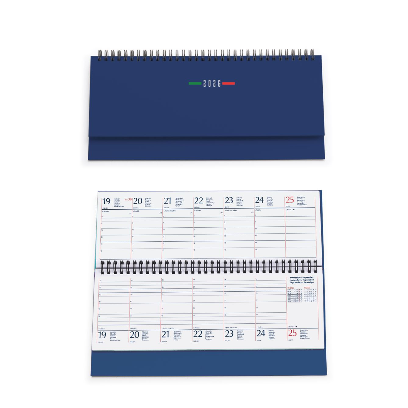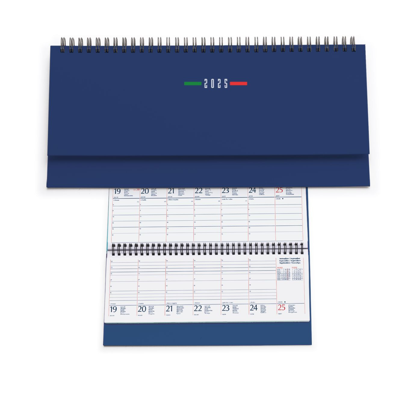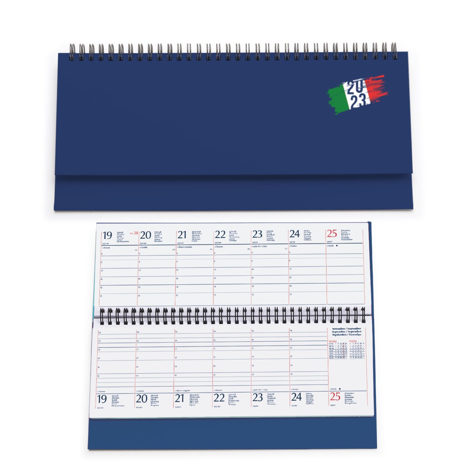 Planning spiralato “Italia”in matra. 128 pagine. Carta usomano bianca 70 gr. Interno stampa 2 colori, datato. Dimensioni cm 30x15 Imballo: 20