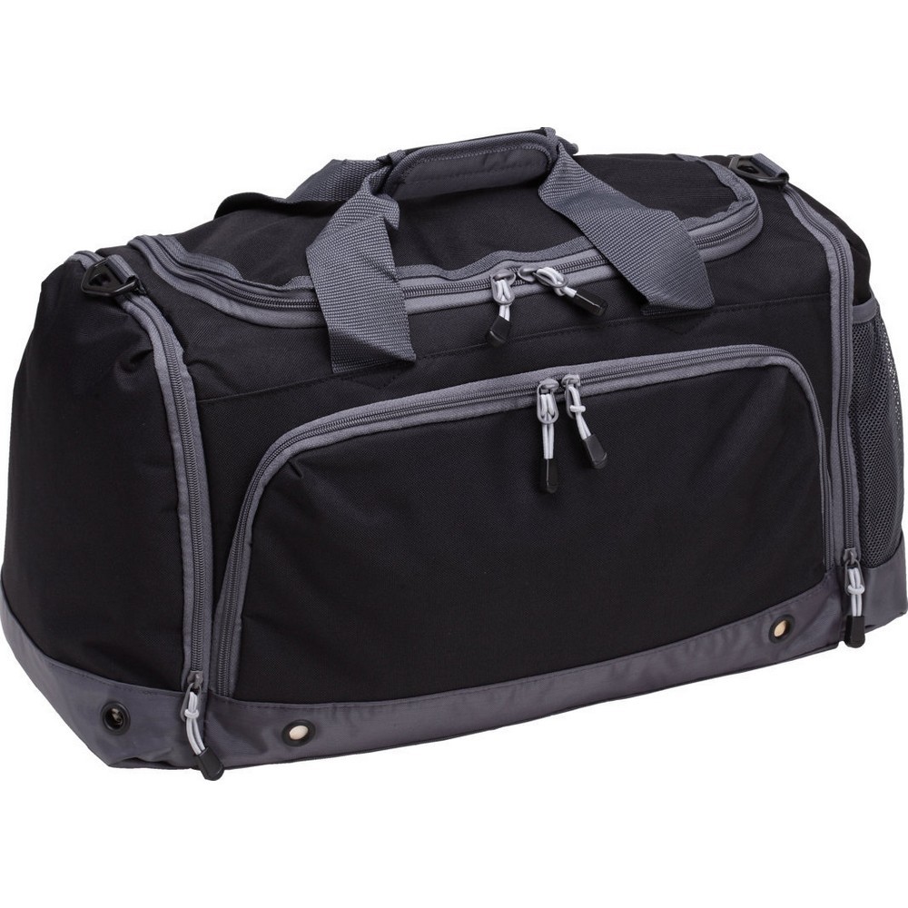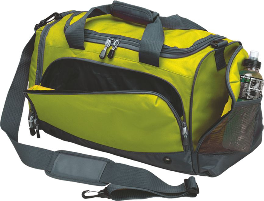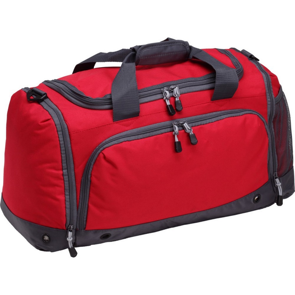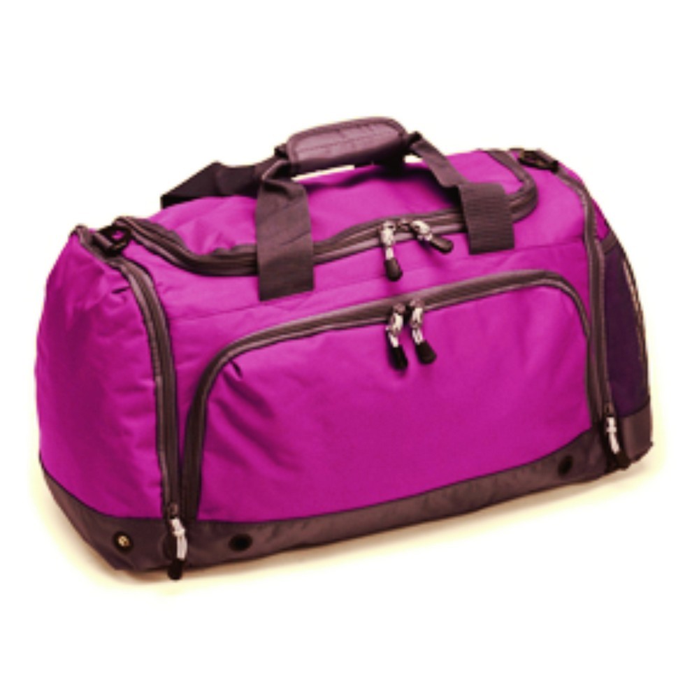 Borsone palestra in poliestere 600D. Chiuso con zip doppio cursore. Doppio manico con im-pugnatura imbottita chiuso da velcro. Tasca anteriore con zip, doppio cursore. Tasche entrambi i lati con zip. Tasca laterale elasticizzata. Completo di tracolla removibile, regolabile, salva spal-le. Piedini antiscivolo in plastica. Colori: rosso, nero, royal, fuxia, verde lime, arancio. Confe-zione in polybag. Dimensioni cm. 27x55x25 Imballo: 20xcolore