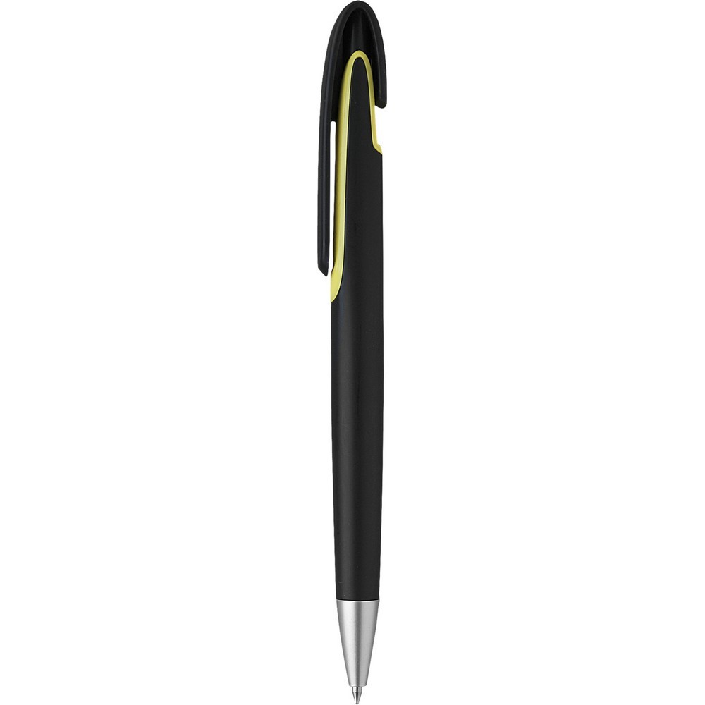 Penna sfera a scatto in plastica con clip in plastica. Fusto nero particolari colorati. Refill nero. Colori: vedi catalogo/sito Imballo: 1000xcolore