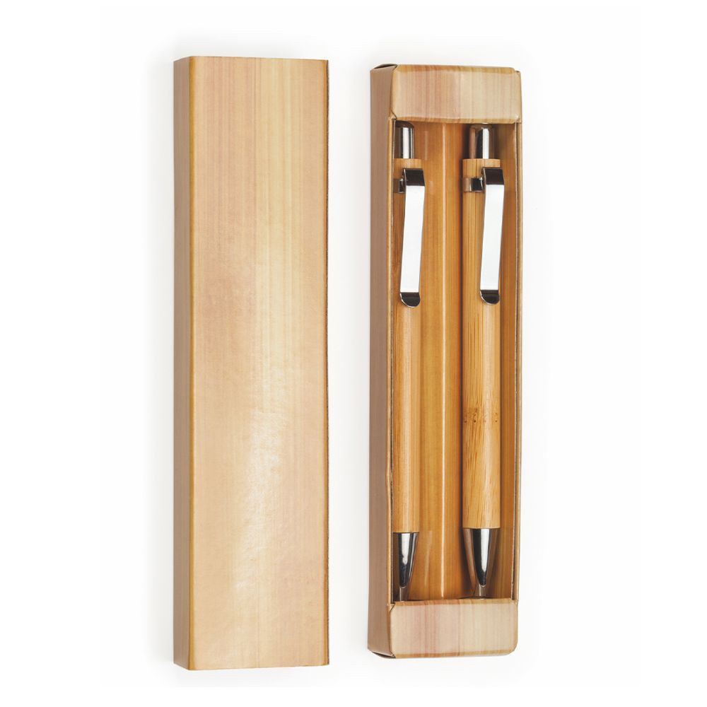 Set bamboo . Penna refillnero + matita. Clip in metallo. Confezione in astuccio effetto legno. Dimensioni cm. 17x2,2x4,1 Imballo: 200