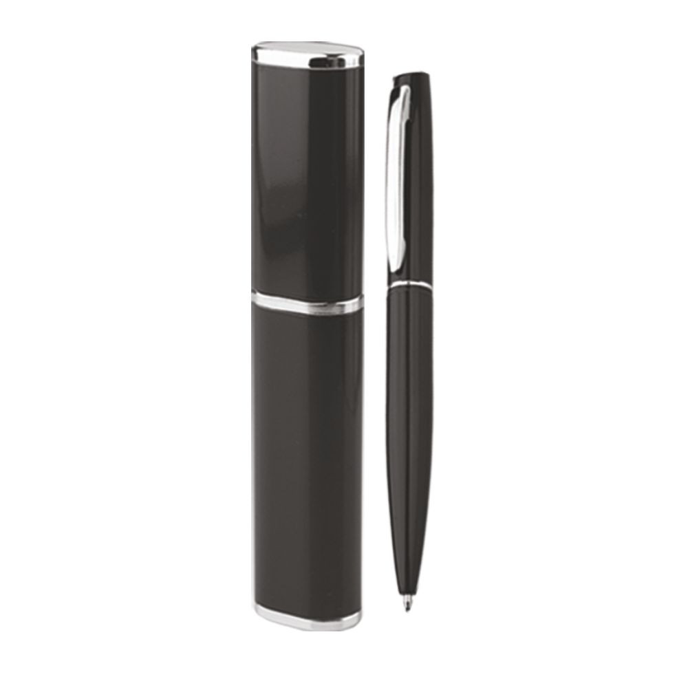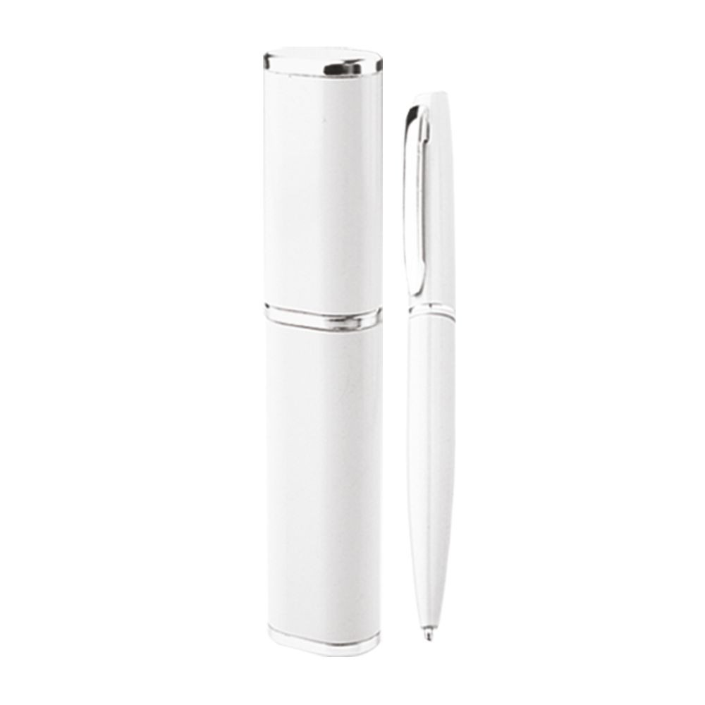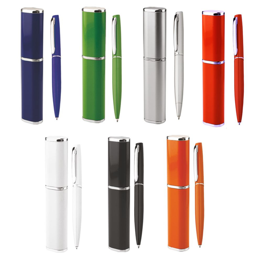 Penna sfera a scatto rotante in alluminio completa di astuccio alluminio e scatolino di cartone bianco (cm.15x2,7x2). Fusto colorato particolari silver. Refill nero. Colori: vedi catalogo/sito. Imballo: 50xcolore
