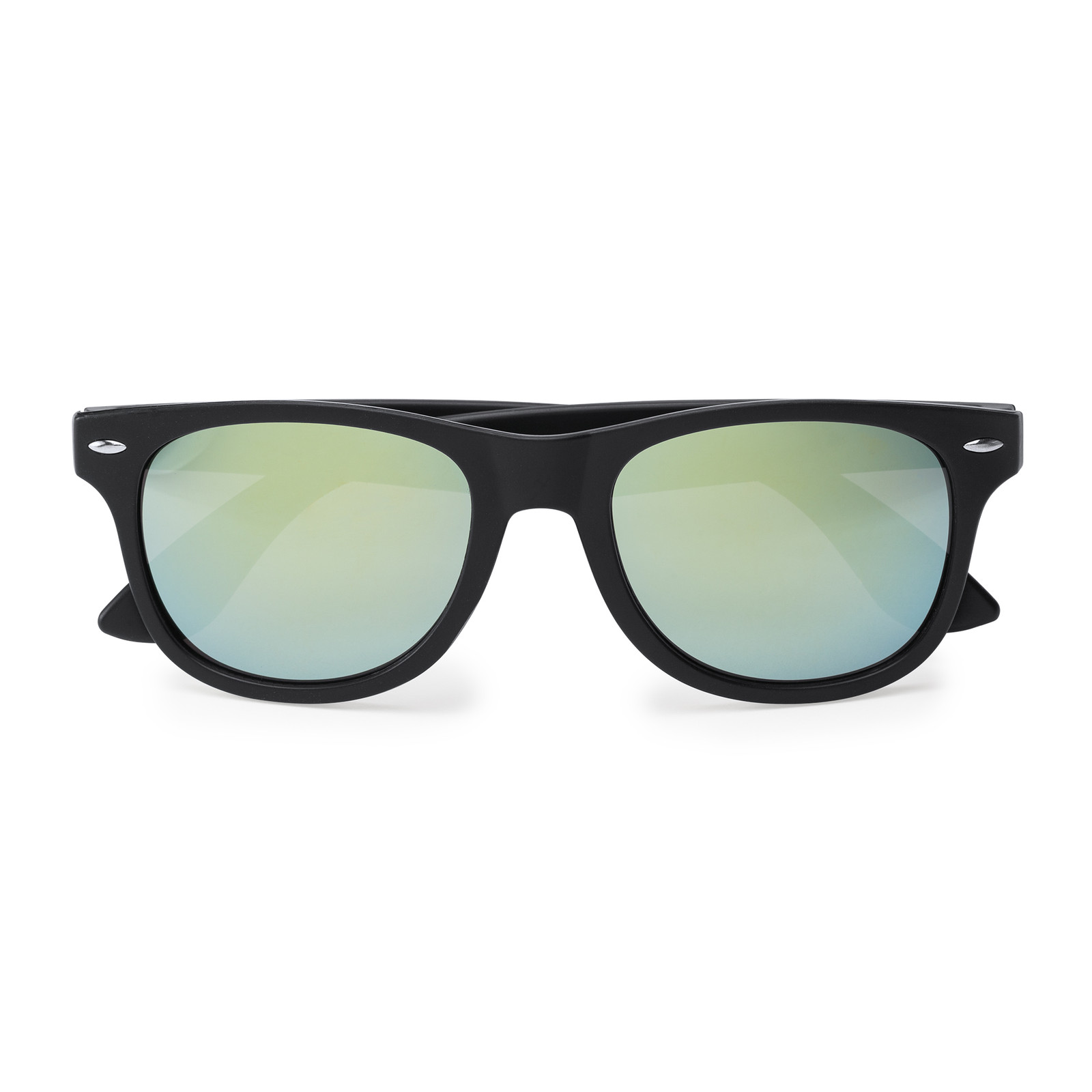 Occhiali da sole finitura nera opaca e lenti specchio. Protezione UV400. In plastica. Dimensioni: cm 14,5x4,9. Imballo 300pz.