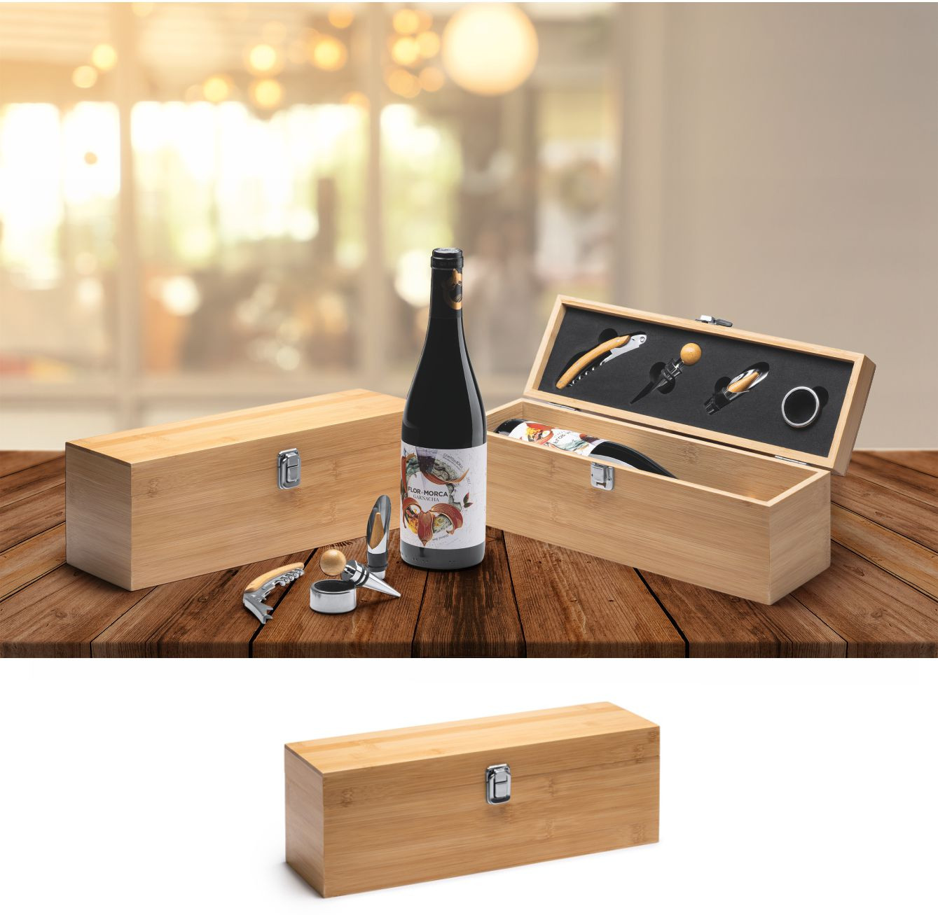 Cofanetto in legno conpleto di kit accessori vino in acciaio inox posti nel coperchio quali cavatappi con tagliacapsule, dispenser, tappo e anello antigoccia. Interno imbottito. Dimensioni: cm 36x12x12