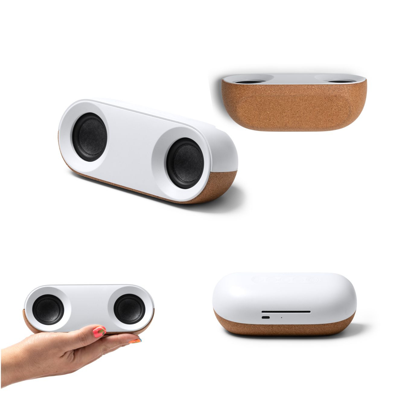 Cassa realizzata in ABS riciclato e sughero naturale. Dotata di batteria ricaricabile da 10w e funzione vivavoce, con cavo di collegamento incluso. In custodia dal design ecologico. Dimensioni: cm 16,6x6,5x6,4