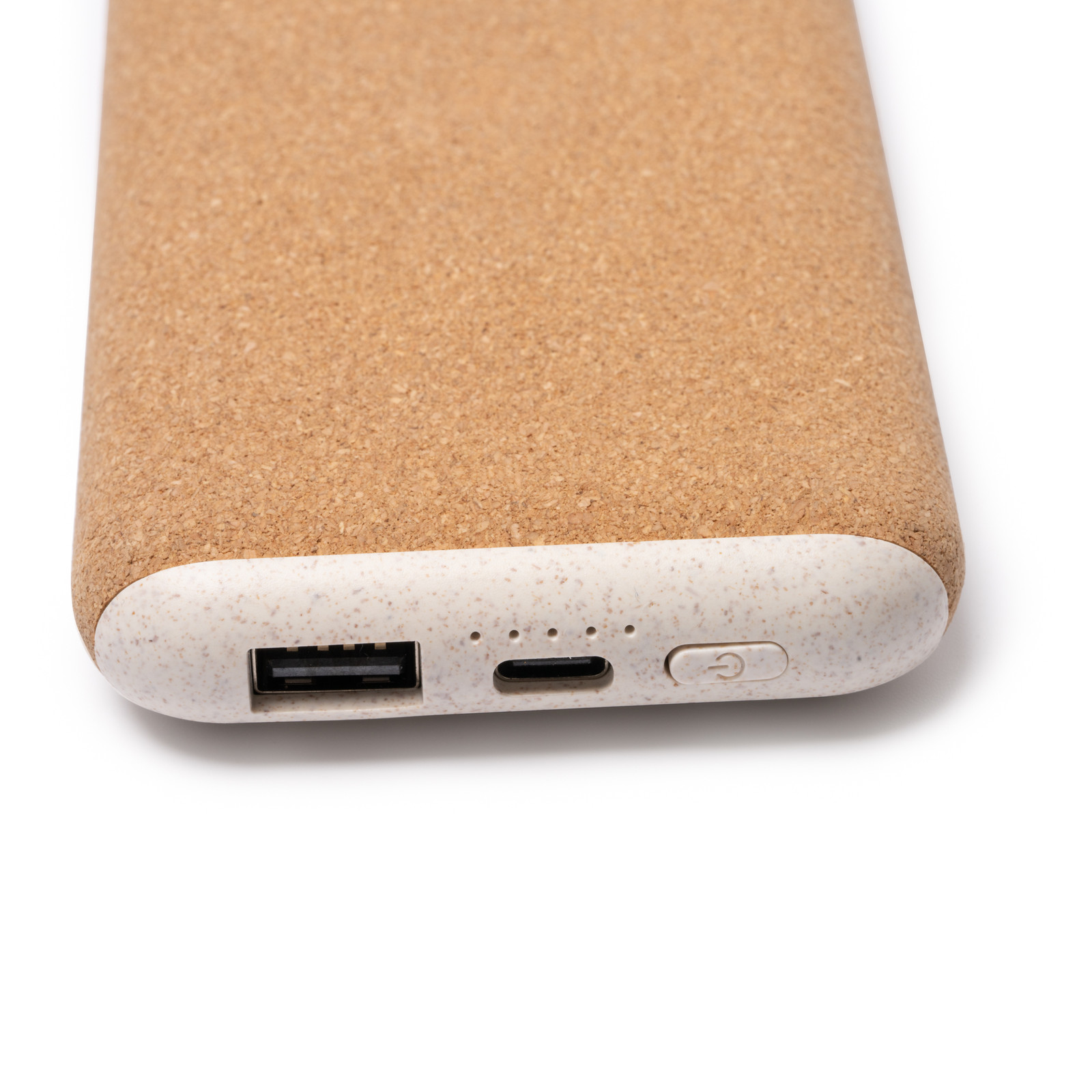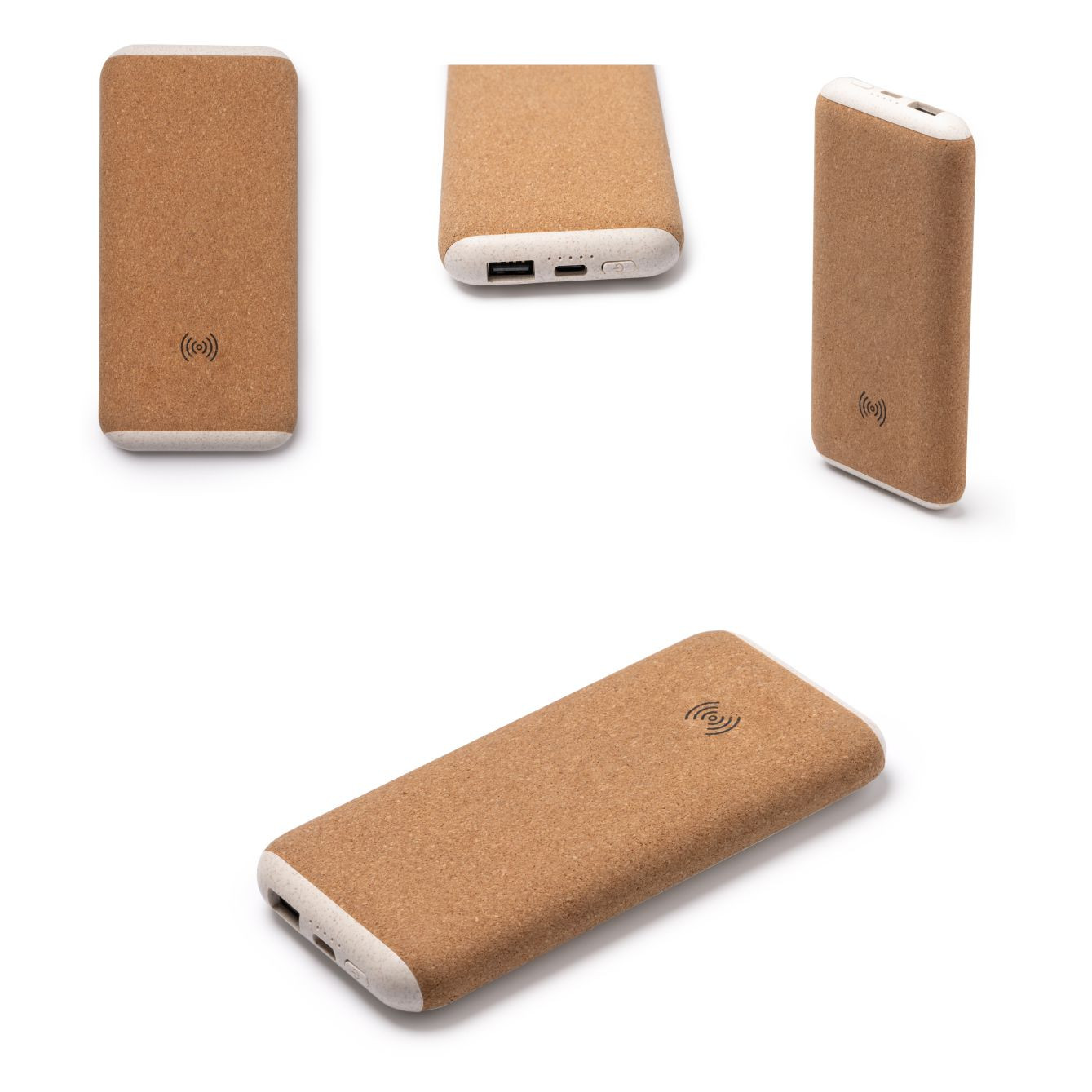 Power bank con struttura in sughero e fibra di frumento. Capacità di 10.000 mAh. Ricarica rapida wireless da 15W. Uscita USB e di tipo C da 20W. Cavo di tipo C incluso. Confezione in scatola di design ecologico. Dimensioni: cm cm 15x1,9x7,2