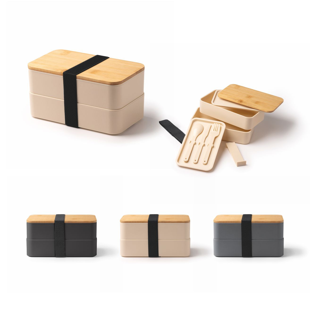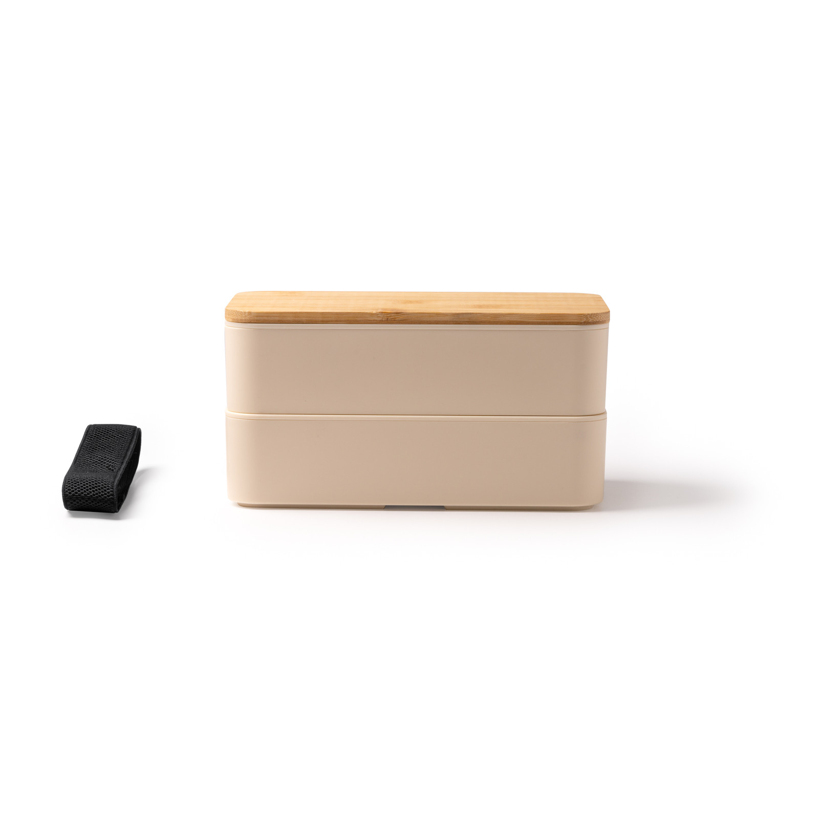 Scatola per il pranzo in PP con due scomparti e coperchio in bamboo. Set di posate, divisorio staccabile e cinghia di serraggio inclusi. Capacità 800 ml. Dimensioni: cm 18x10,6x9,6