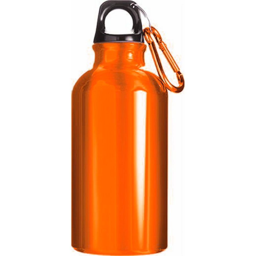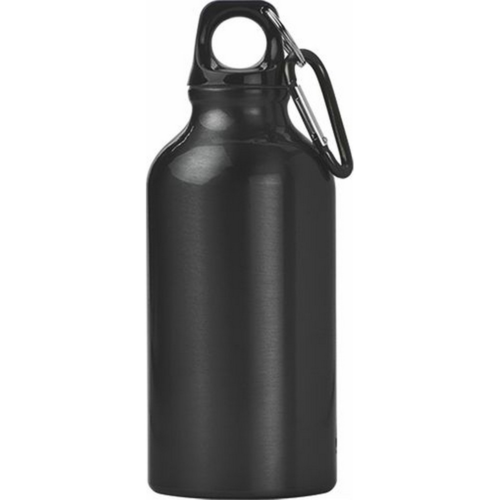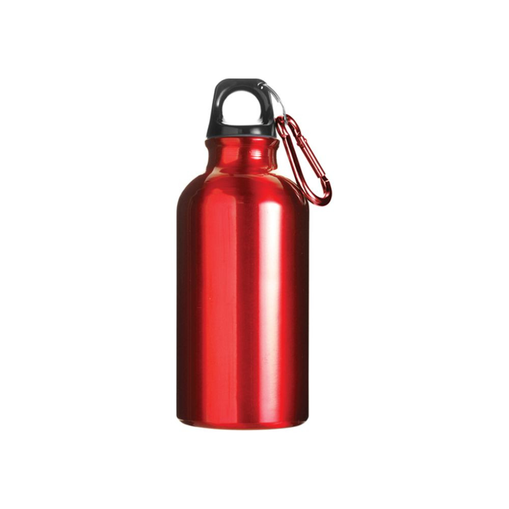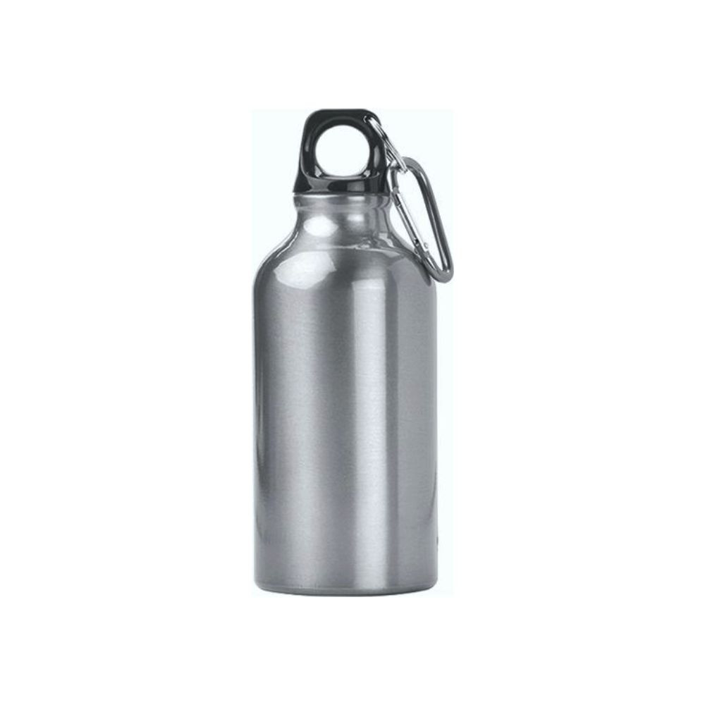 Borraccia in alluminio. Resistente all’acqua. Completa di moschettone. Capacità 400ml. Colori: vedi catalogo/sito. Confezione in polybag. Dimensioni Ø cm 7 h 12 Imballo: 60xcolore