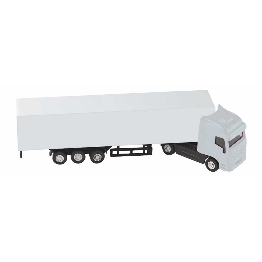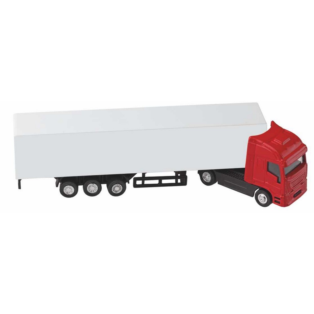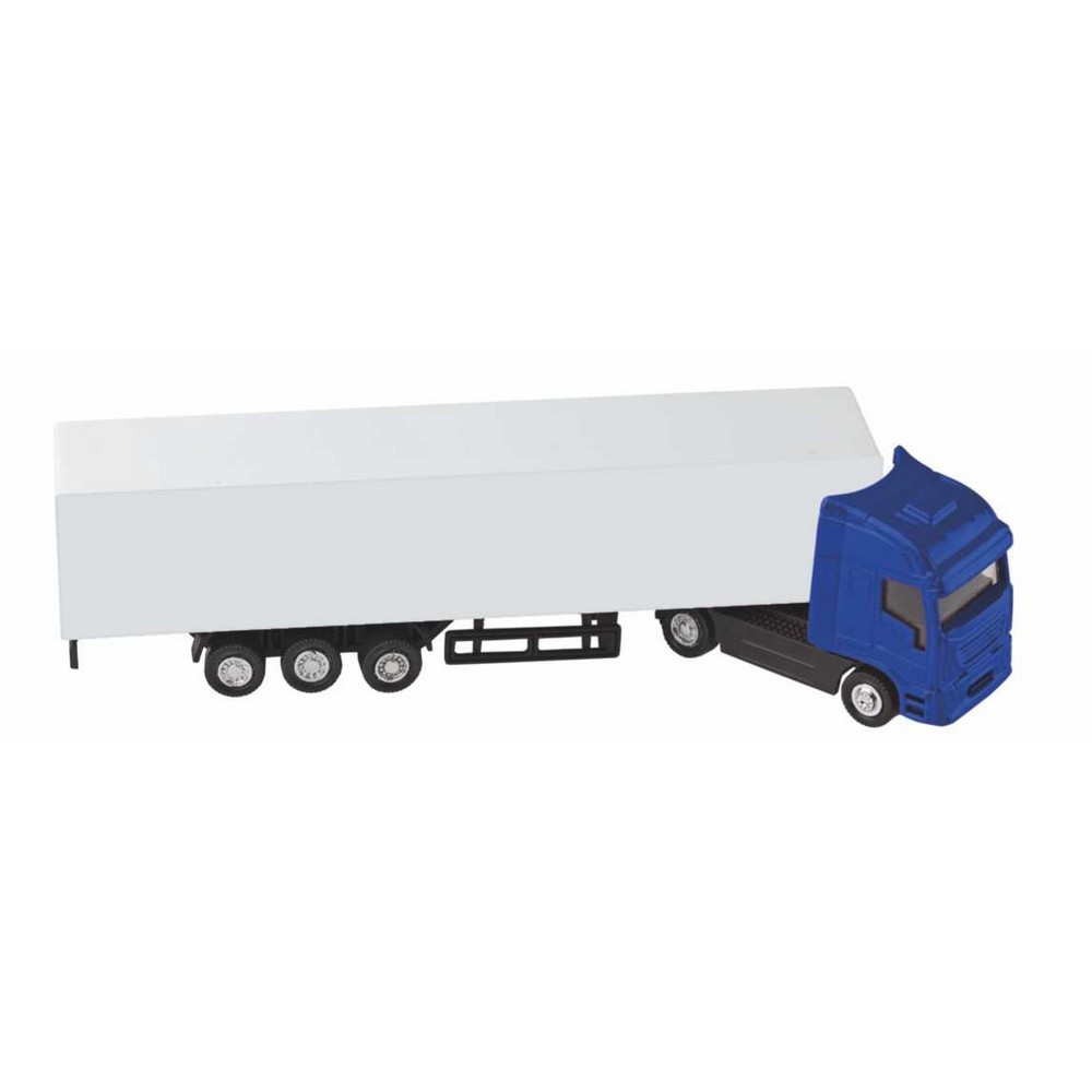 Camion in plastica. Cabina in metallo, rimorchio in plastica. Ideale per stampa UV. Colori: blu, rosso, nero, bianco. Confezione in astuccio trasparente. Dimensioni cm. 19,5x3,4x4,5