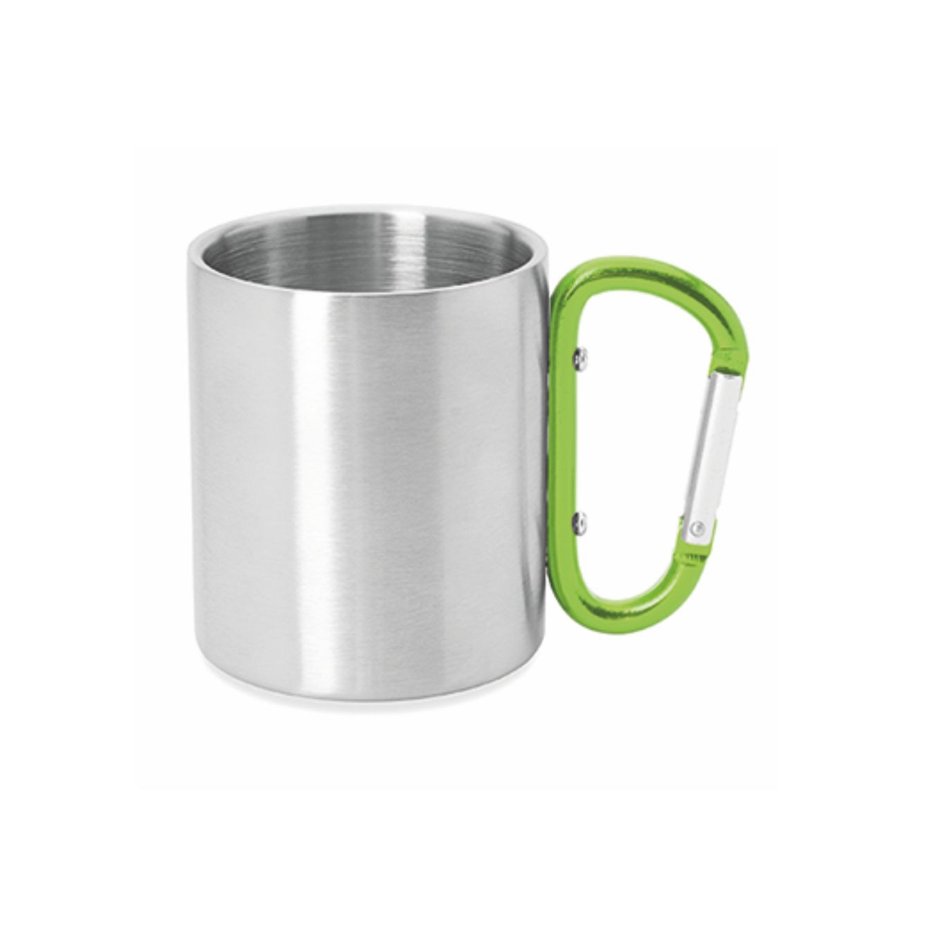 Tazza in acciaio doppia parete, impugnatura con moschettone. Dimensione: cm ø 7 H 8. Confezione: in astuccio . N.B. Per motivi logistici è necessaria la spedizione su pallet. Si consiglia l'acquisto di 150pz.