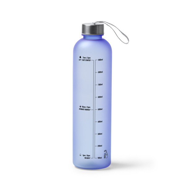 Bottiglia in tritano con corpo traslucido, tappo a vite e maniglia per il trasporto. Include raccomandazione per l'idratazione e indicatore di capacità. Capacità: 1 litro. Confezione in scatola. Dimensioni: cm 27,5x7,5Ø. Il complemento ideale per chi ama essere organizzato con stile.