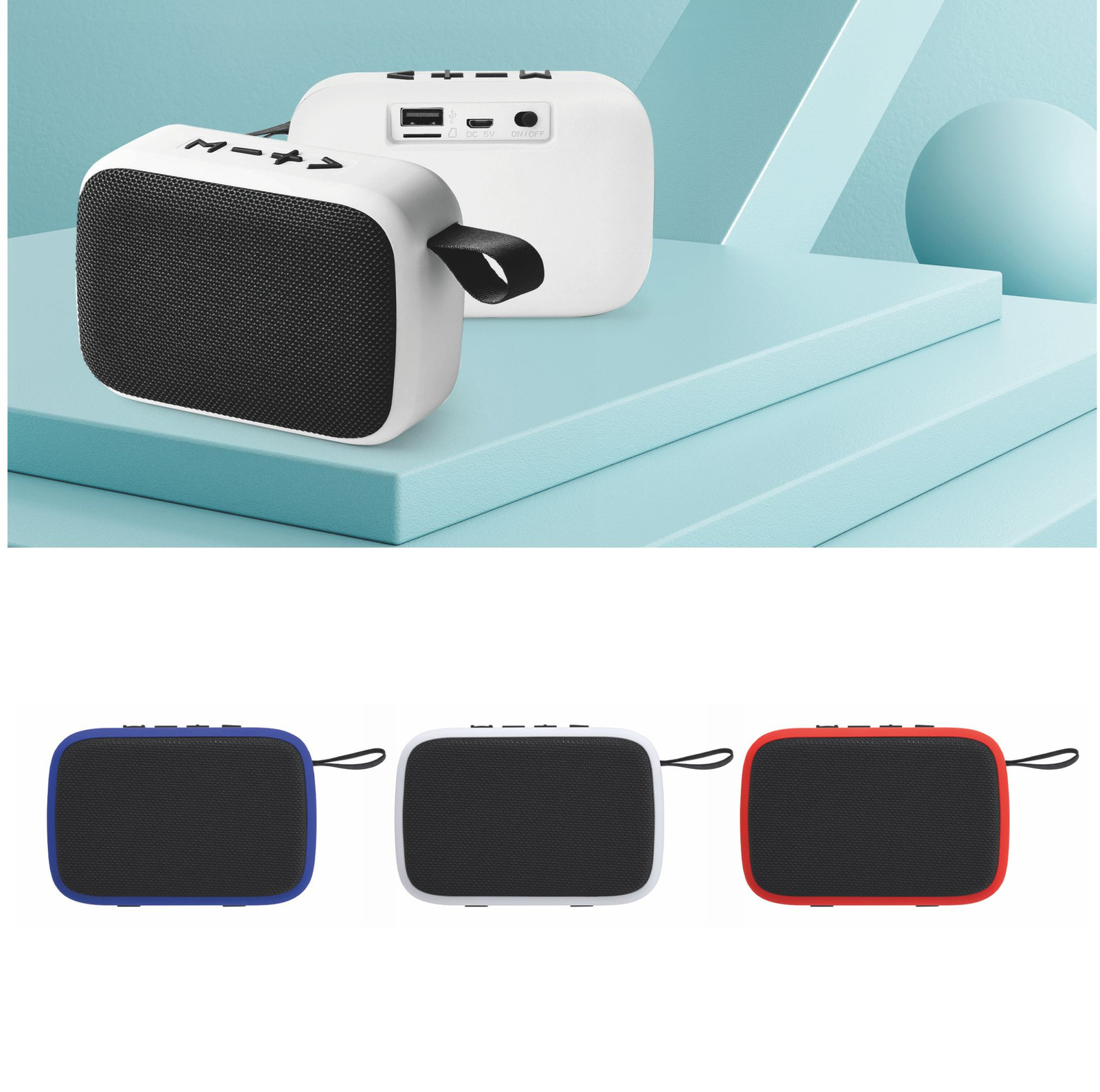 Speaker wireless Bluetooth. Corpo in gomma opaca. Maniglia di trasporto, pulsanti e tessuto in tinta. Potenza 3W. Batteria ricaricabile. Cavo incluso. Confezione in scatola design. Dimensioni: cm 11x 8,3 x 4.