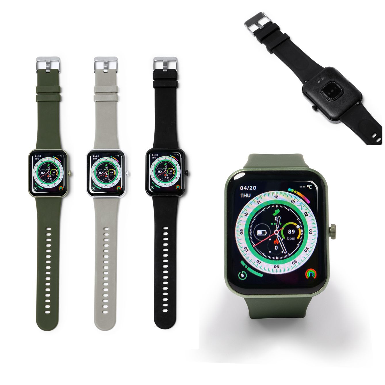 Smartwatch con quadrante con finitura metallica e cinturino in silicone. Schermo touchscreen IPS da 1,89”. Resistente all’acqua e alla polvere IP67. Dispone di oltre 100 modalità di sport, monitoraggio della frequenza cardiaca, controllo delle chiamate, c