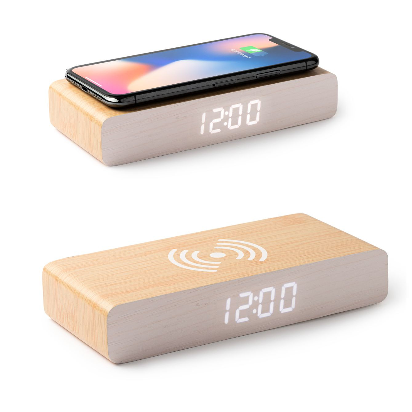 Orologio con caricabatterie wireless da 5W in legno MDF, con 3 modalità di illuminazione. Dispone di altre funzioni aggiuntive: ora, data, sveglia e temperatura. È possibile impostare fino a 3 allarmi indipendenti. Cavo di ricarica USB incluso. Confezione