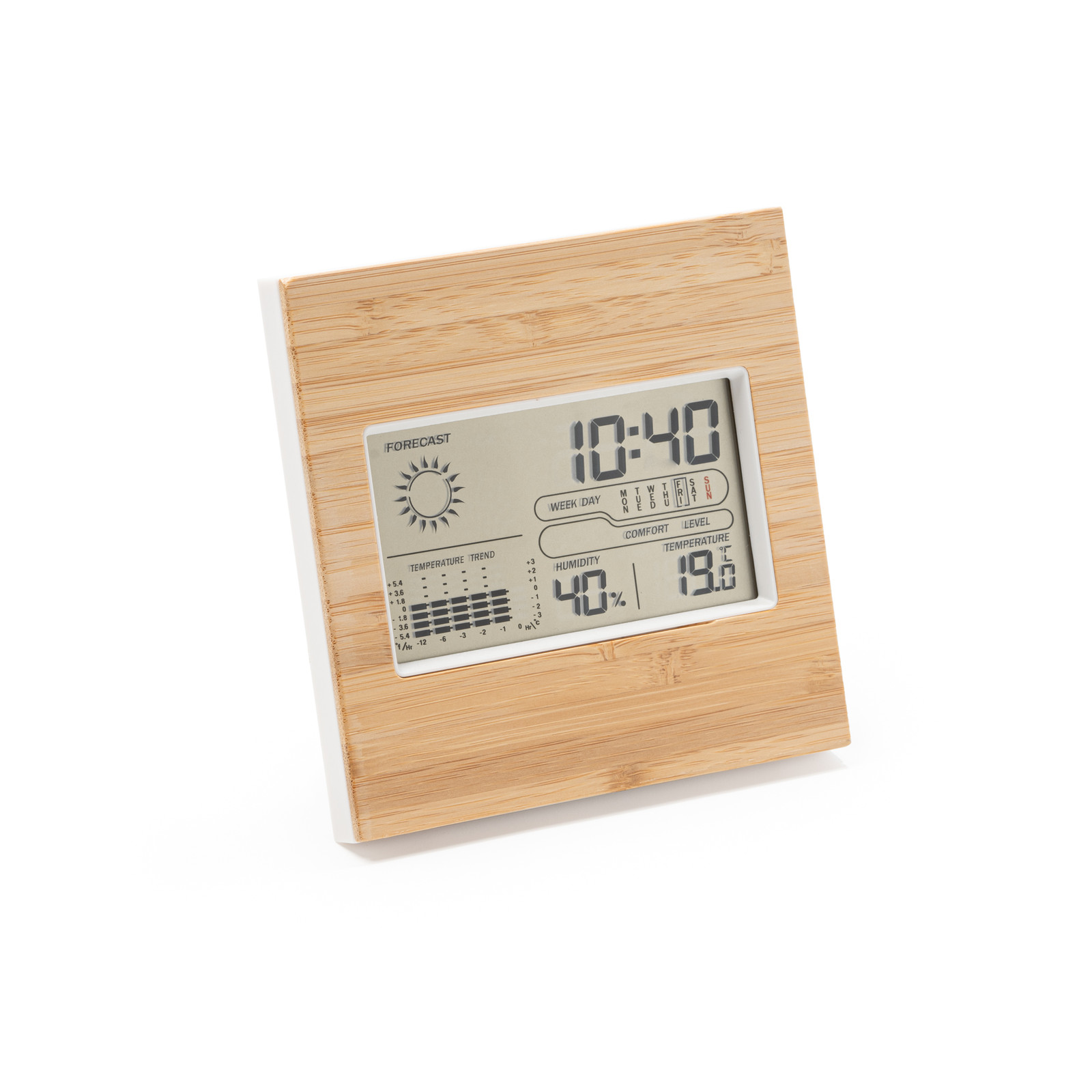 Stazione meteorologica con custodia frontale in bamboo. Funzione di orologio, calendario e allarme con sensori di temperatura e umidità. Dimensioni: cm 13x13. Confezione in astuccio. Imballo: 40pz