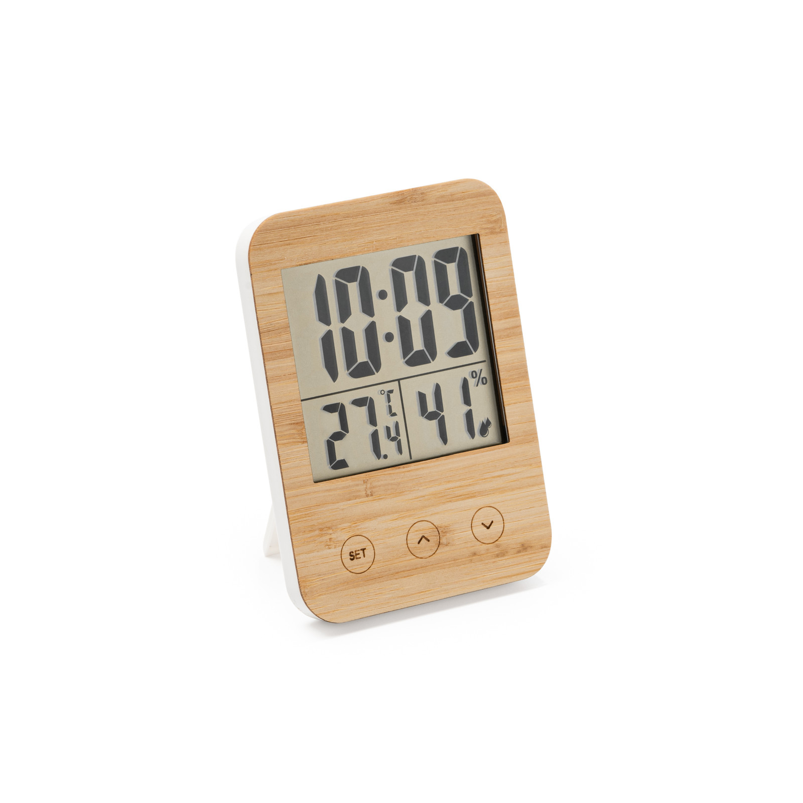 Stazione meteorologica con involucro frontale in bamboo. Funzione orologio con sensori di temperatura e umidità. Dimensioni: cm 8,6x12x2. Confezione in astuccio. Imballo: 50pz