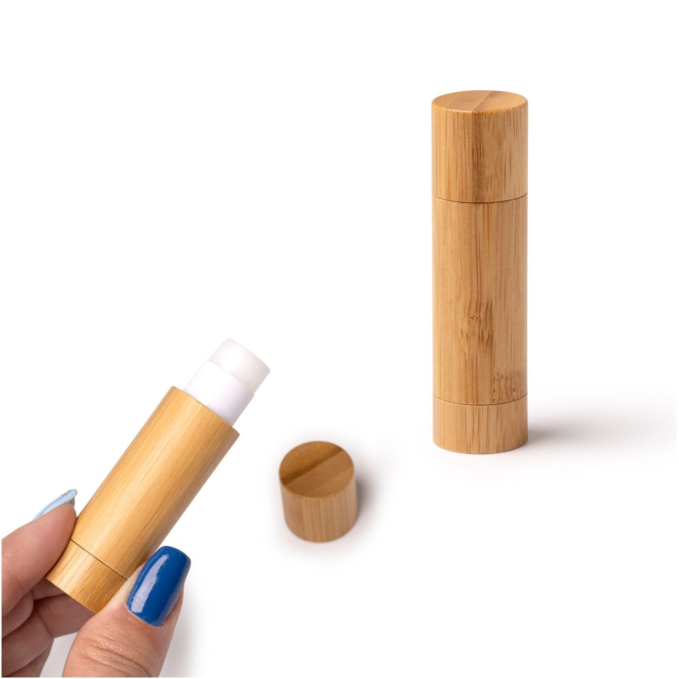 Balsamo per labbra in un pratico astuccio di bamboo. Protezione SPF15. Dimensioni: cm 7,5x2Ø