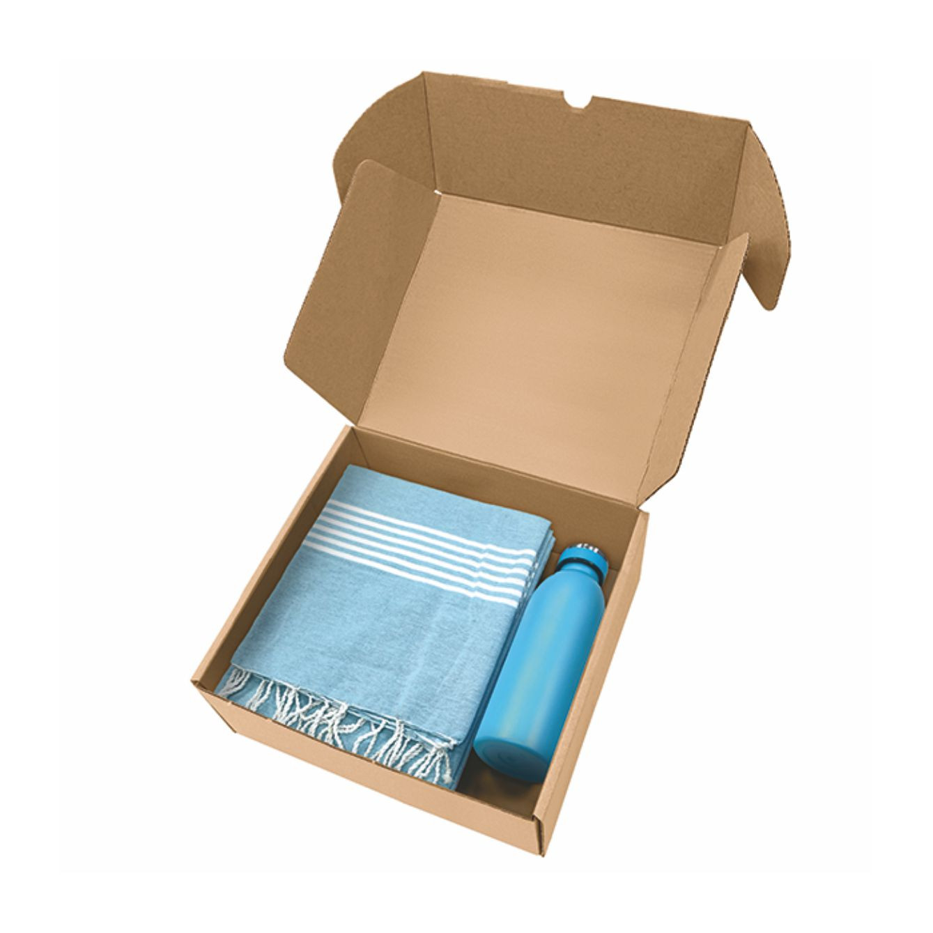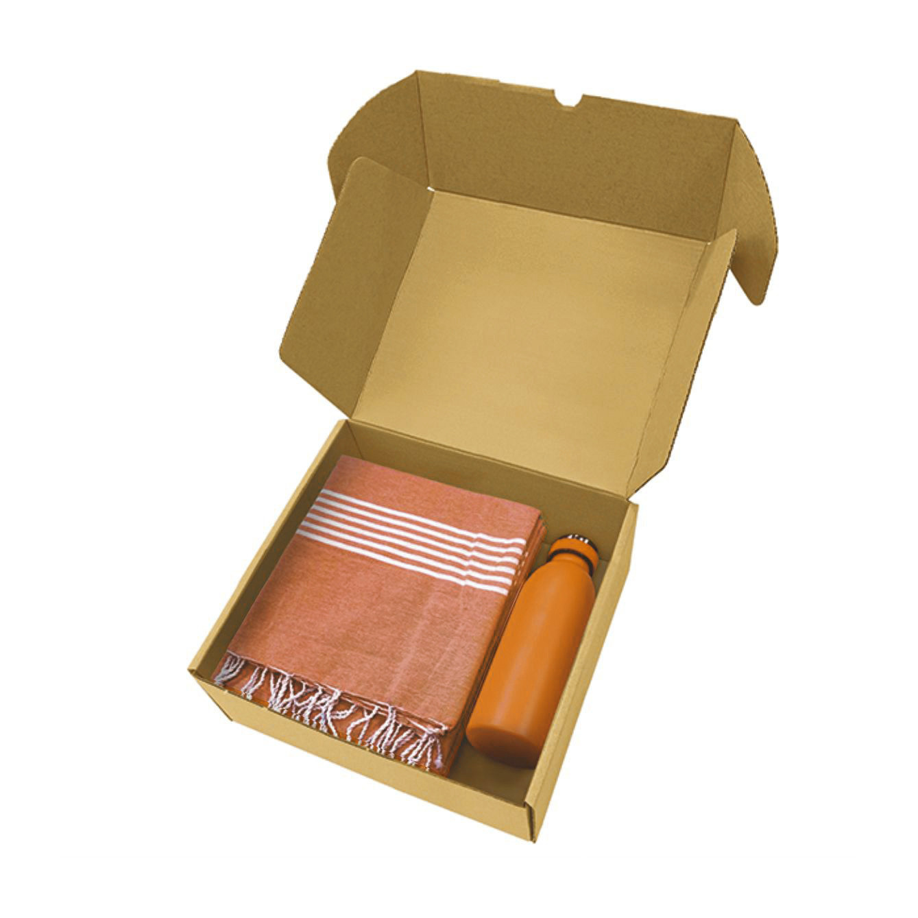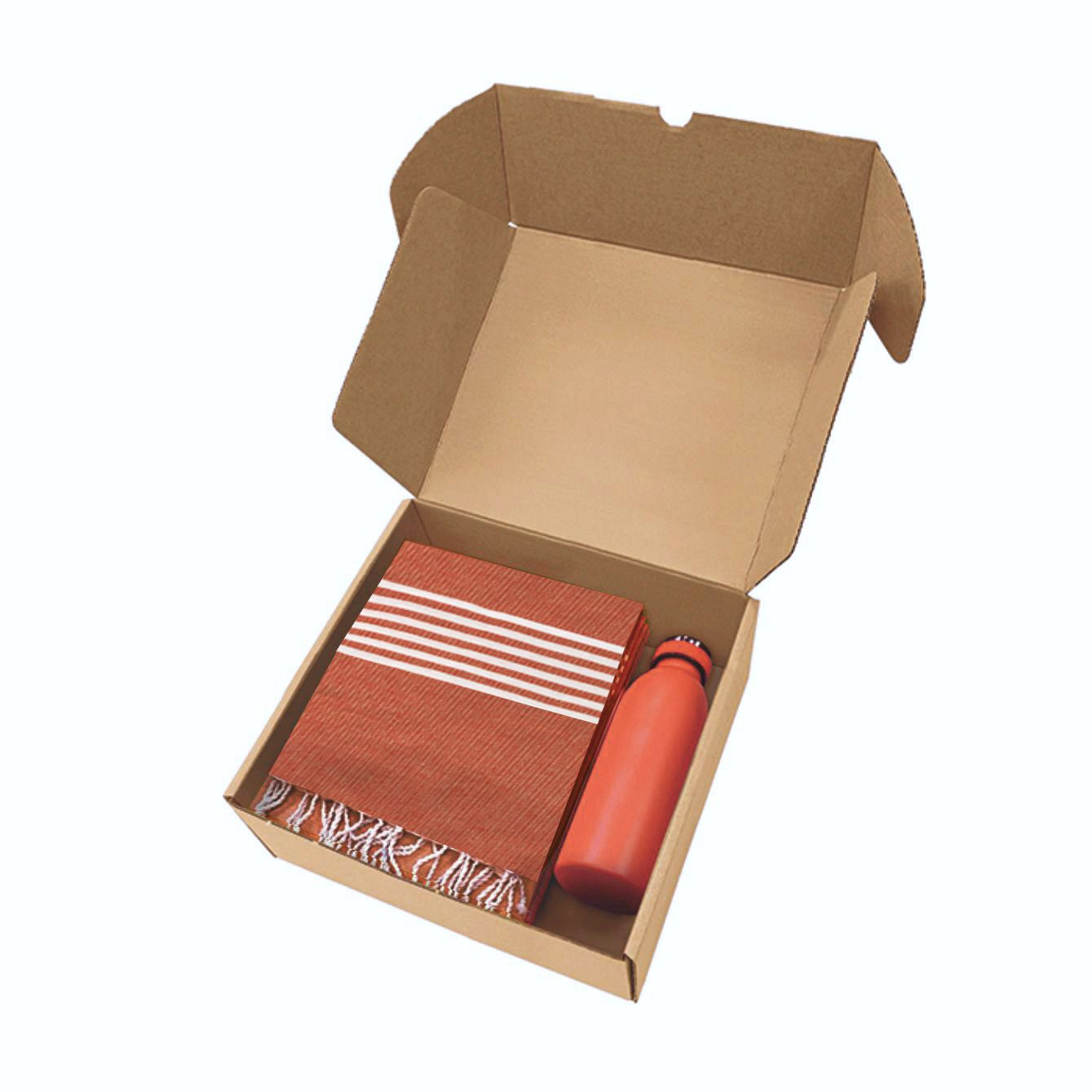 Box in cartone ondulato riciclato con all'interno art. 1093 telo mare con frange da 170 g/m² in 80% cotone e 20% poliestere e art. 8620 borraccia termica da 500ml in acciaio inox. - La confezione di presentazione è progettata per regali di 26,5x9x30 cm.