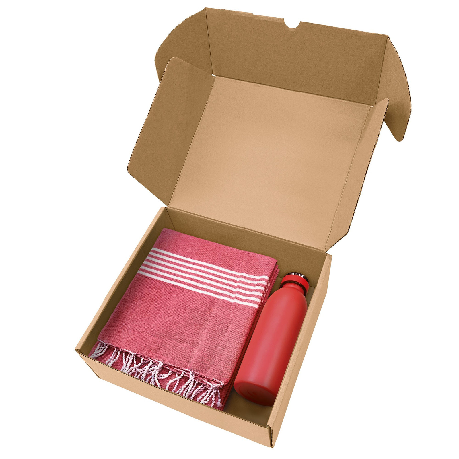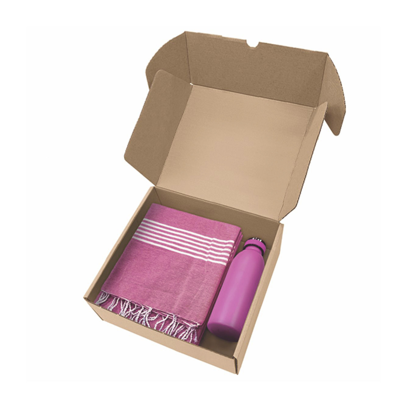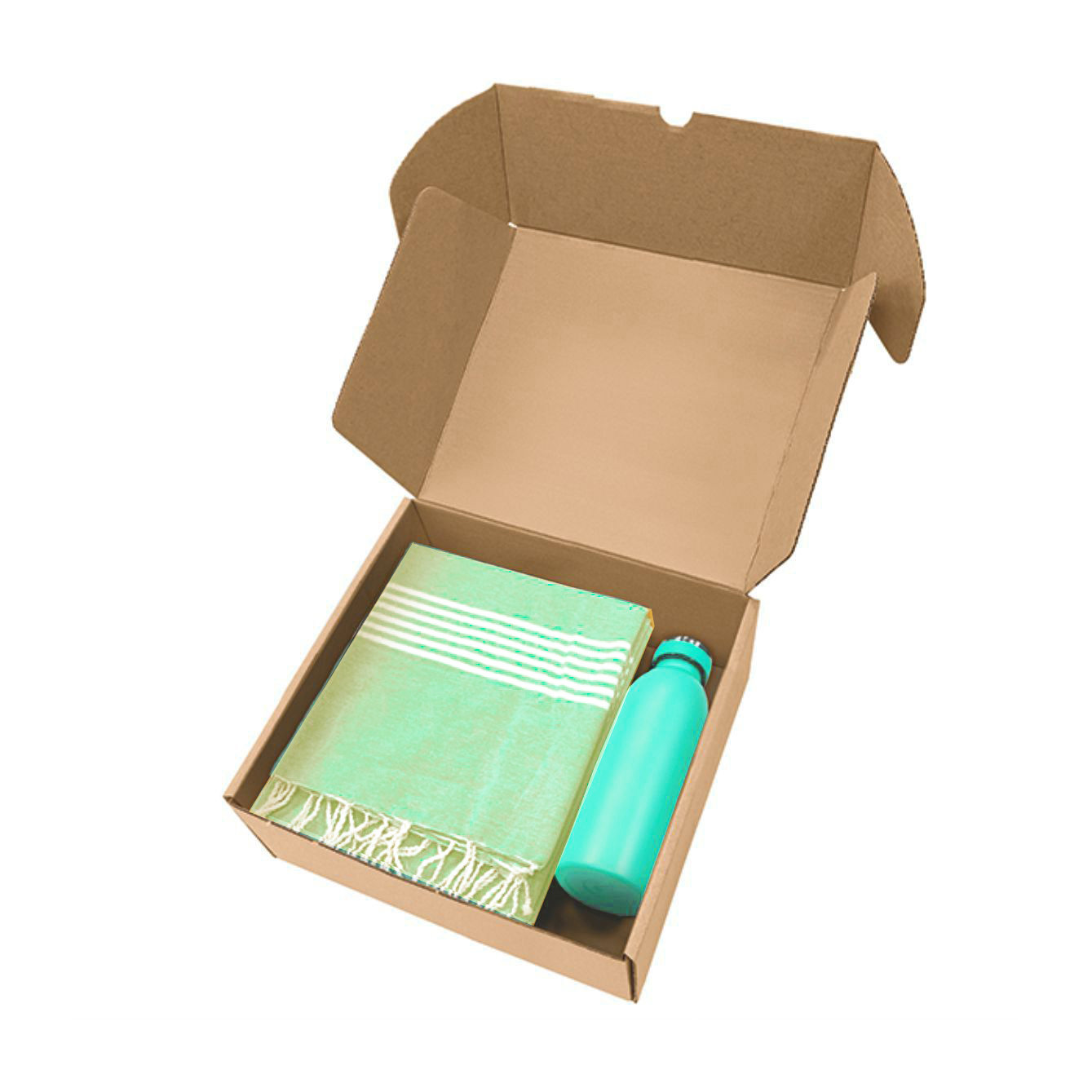 Box in cartone ondulato riciclato con all'interno art. 1093 telo mare con frange da 170 g/m² in 80% cotone e 20% poliestere e art. 8620 borraccia termica da 500ml in acciaio inox. - La confezione di presentazione è progettata per regali di 26,5x9x30 cm.