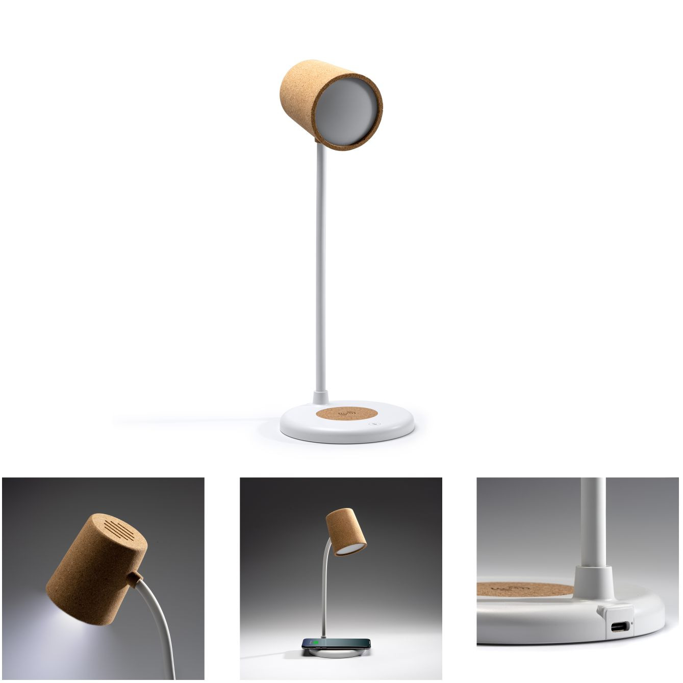 Lampada da tavolo con dettagli in sughero, con caricatore wireless da 10W integrato sulla base e altoparlante wireless da 3W. Luce LED con tre modalità di illuminazione. Dimensioni: cm 33x12Ø