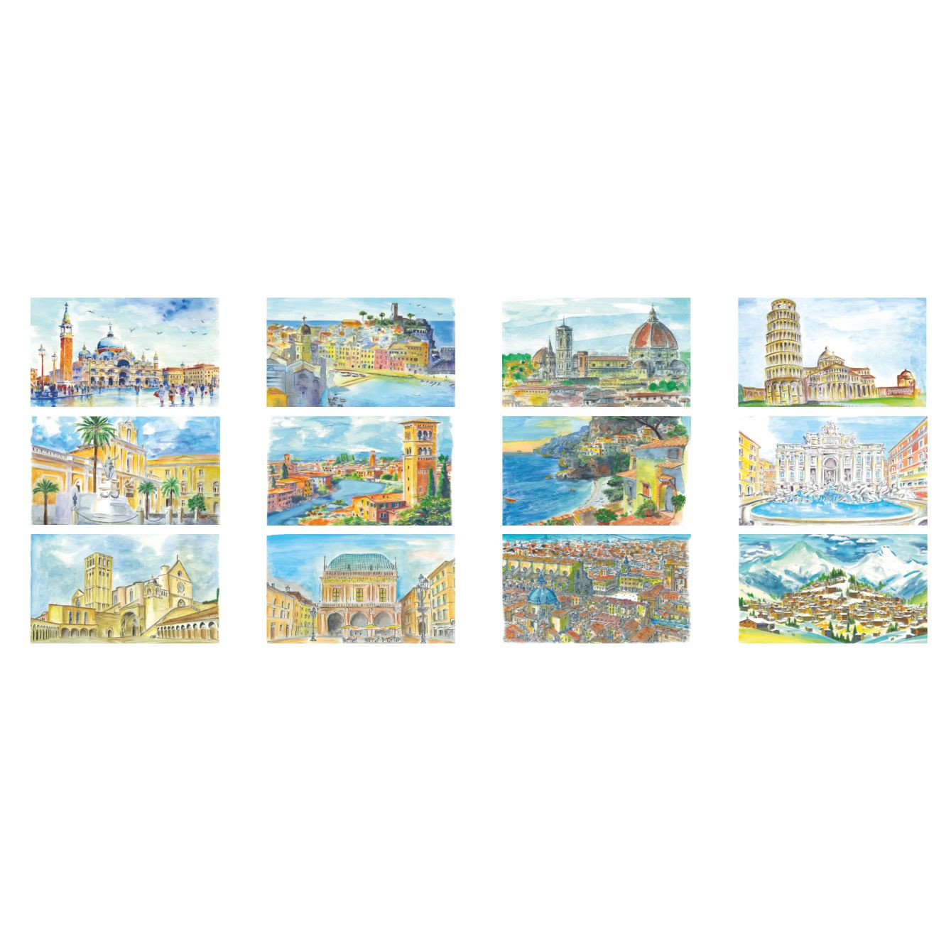 Calendario “Citta’ d’Italia”. Trimestrale 12 fogli + copertina. Carta patinata. Dimensioni: cm 31x53, testata rinforzata cm 31x10,8. Imballo: 100. Carta Patinata . Gr. 90 mq